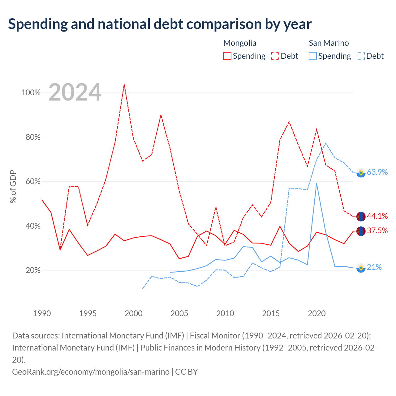 Mongolia has $10.5B in government debt (44.1% of GDP), compared to $1.39B (63.9% of GDP) in San Marino.