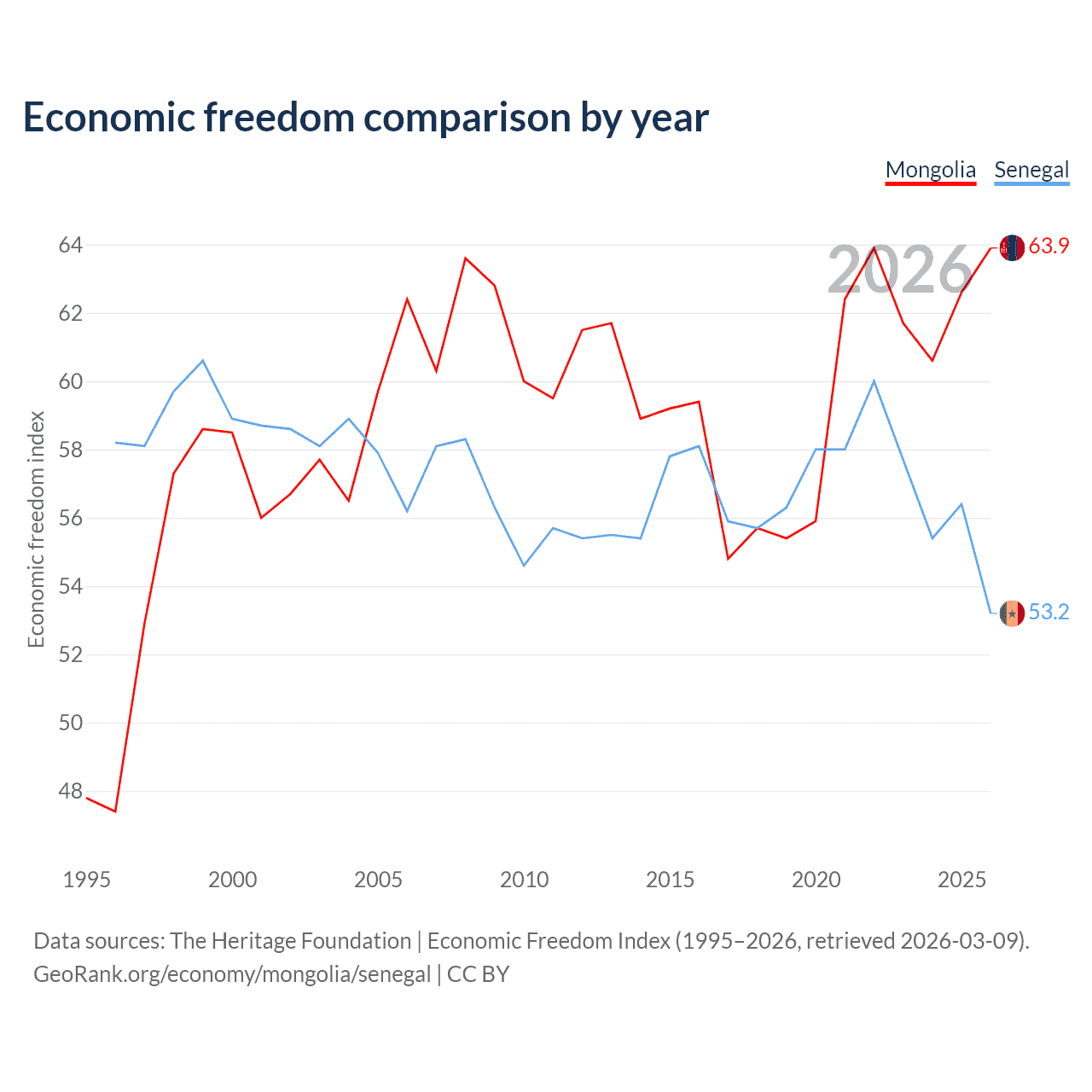 The Economic Freedom Index for Mongolia is 63.9, ranking 76/197, compared to 53.2 for Senegal, ranking 140/197. The chart above displays a comparison of annual changes in economic freedom indexes.