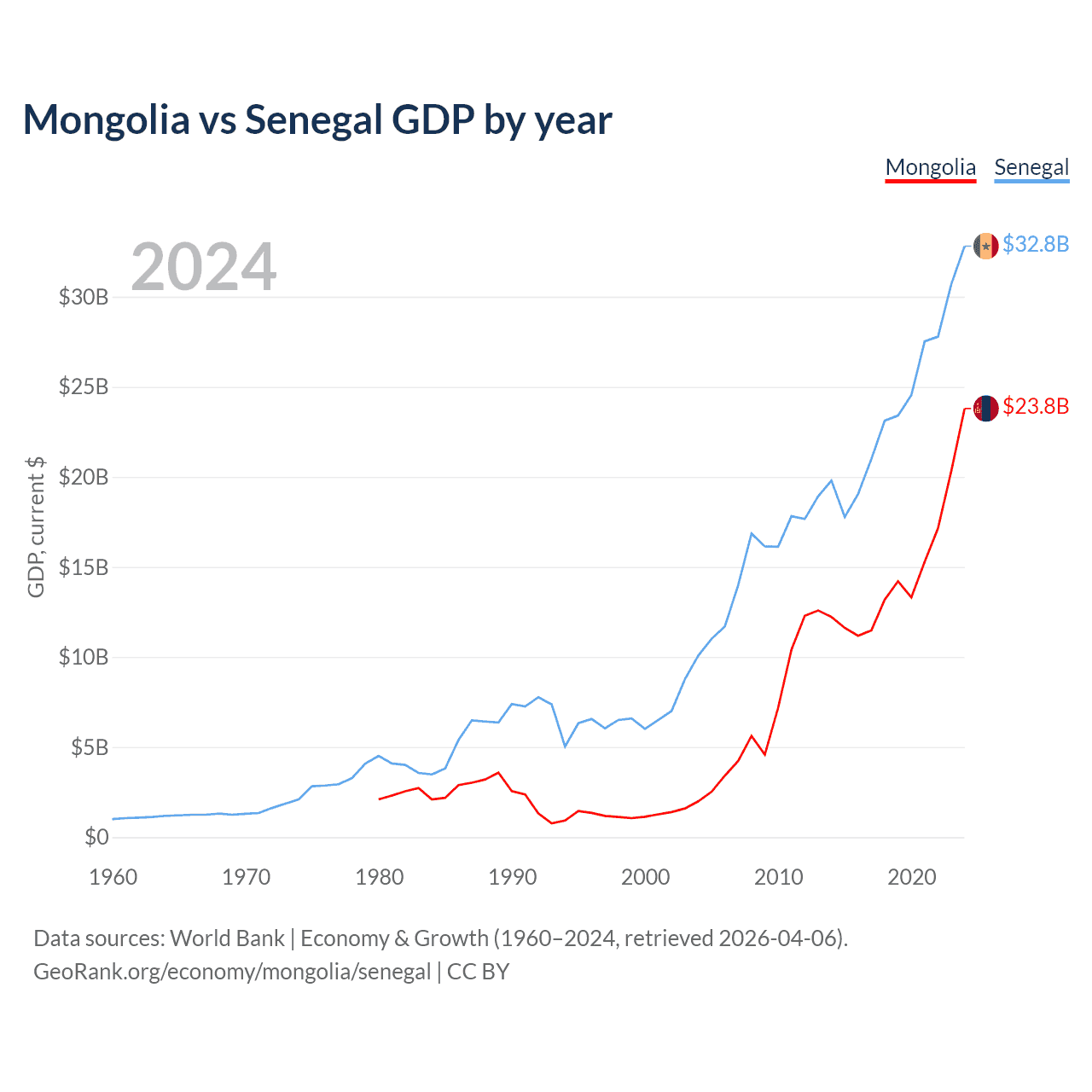 Mongolia has a GDP of $23.8B compared to $32.8B for Senegal, ranking 121/197 and 109/197 by economy size, respectively.