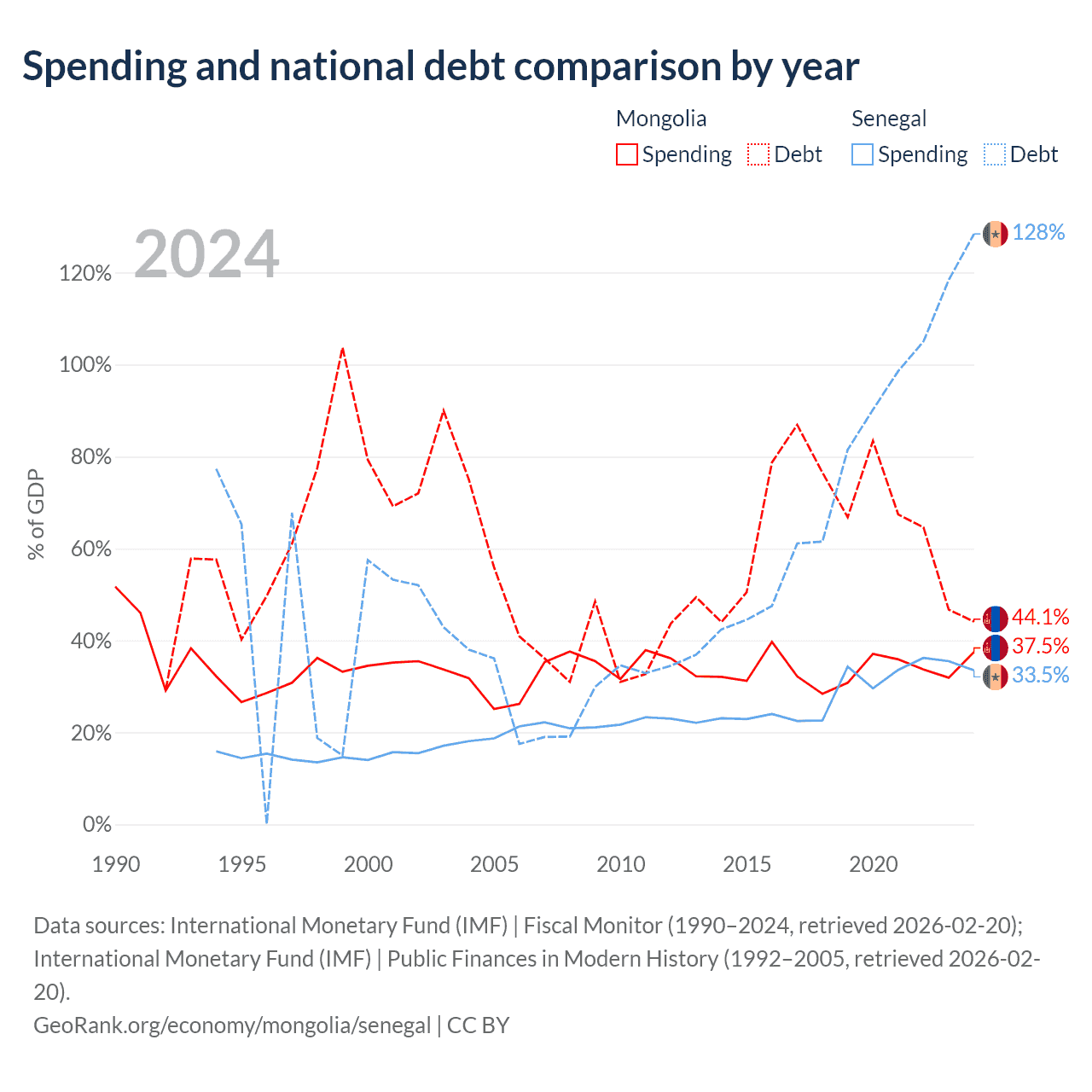 Mongolia has $10.5B in government debt (44.1% of GDP), compared to $42.1B (128.4% of GDP) in Senegal.