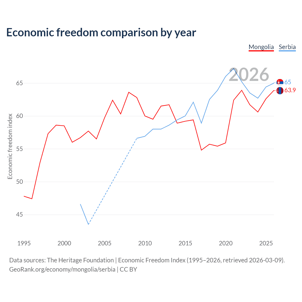 The Economic Freedom Index for Mongolia is 63.9, ranking 76/197, compared to 65 for Serbia, ranking 68/197. The chart above displays a comparison of annual changes in economic freedom indexes.