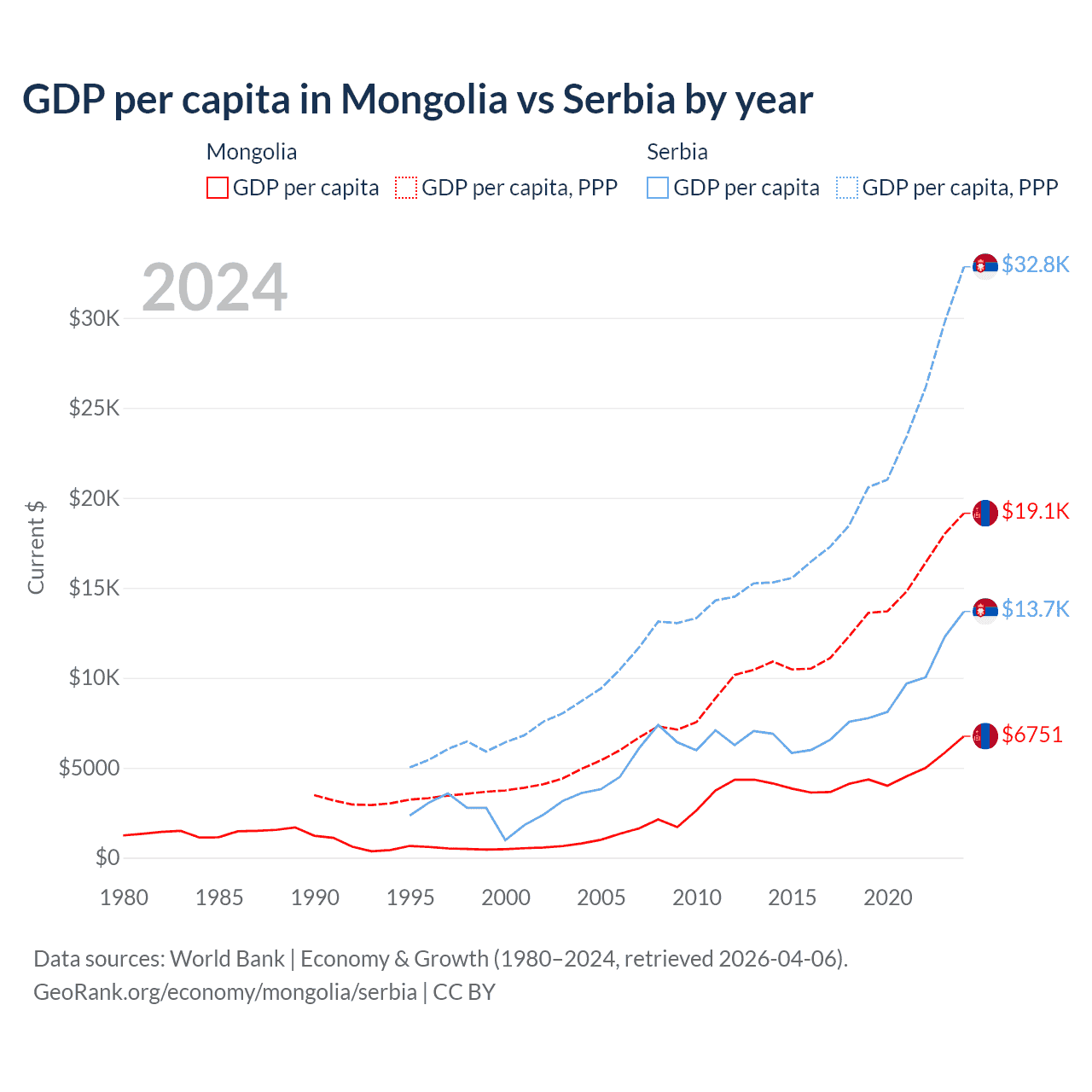 GDP per capita in Mongolia vs Serbia by year