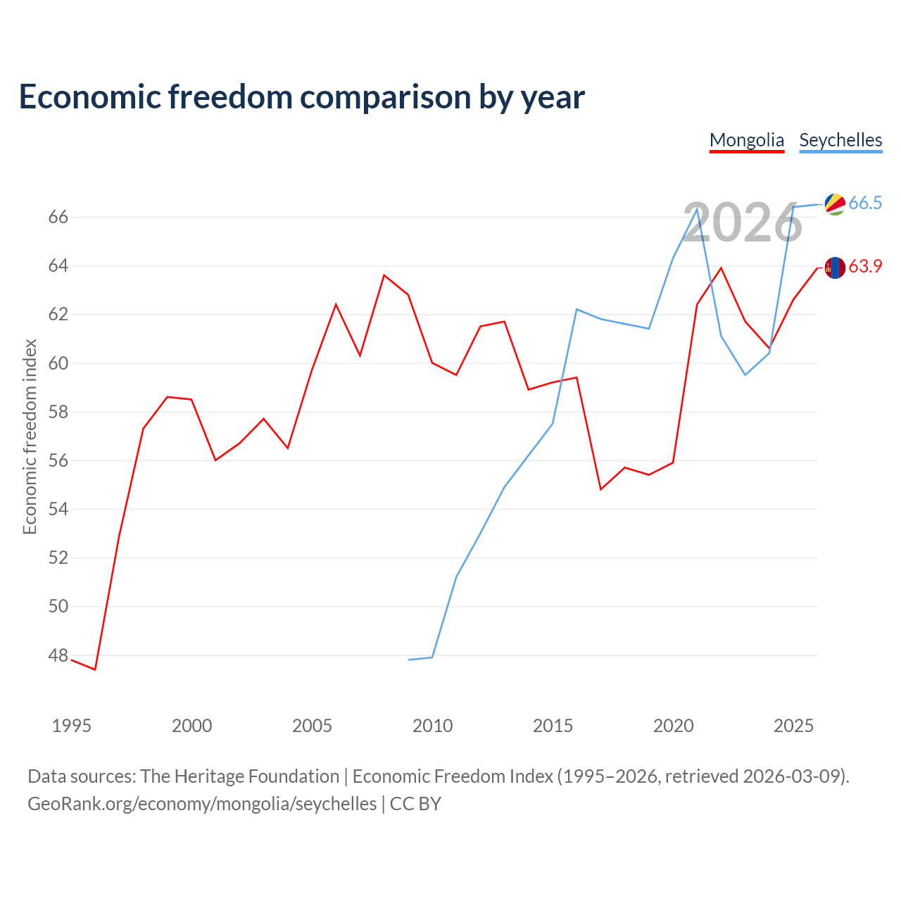 The Economic Freedom Index for Mongolia is 63.9, ranking 76/197, compared to 66.5 for the Seychelles, ranking 60/197. The chart above displays a comparison of annual changes in economic freedom indexes.