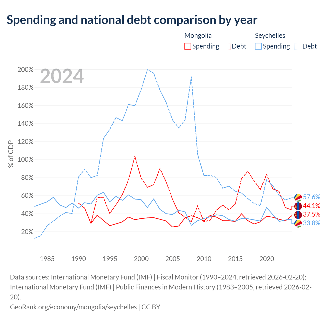 Mongolia has $10.5B in government debt (44.1% of GDP), compared to $1.25B (57.6% of GDP) in the Seychelles.