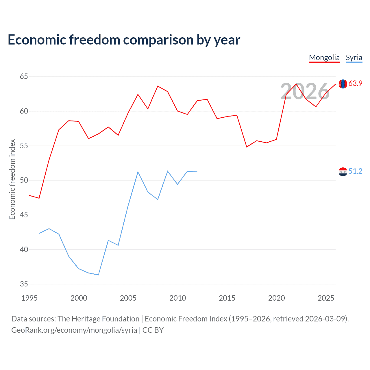 The Economic Freedom Index for Mongolia is 63.9, ranking 76/197, compared to 51.2 for Syria, ranking 155/197. The chart above displays a comparison of annual changes in economic freedom indexes.