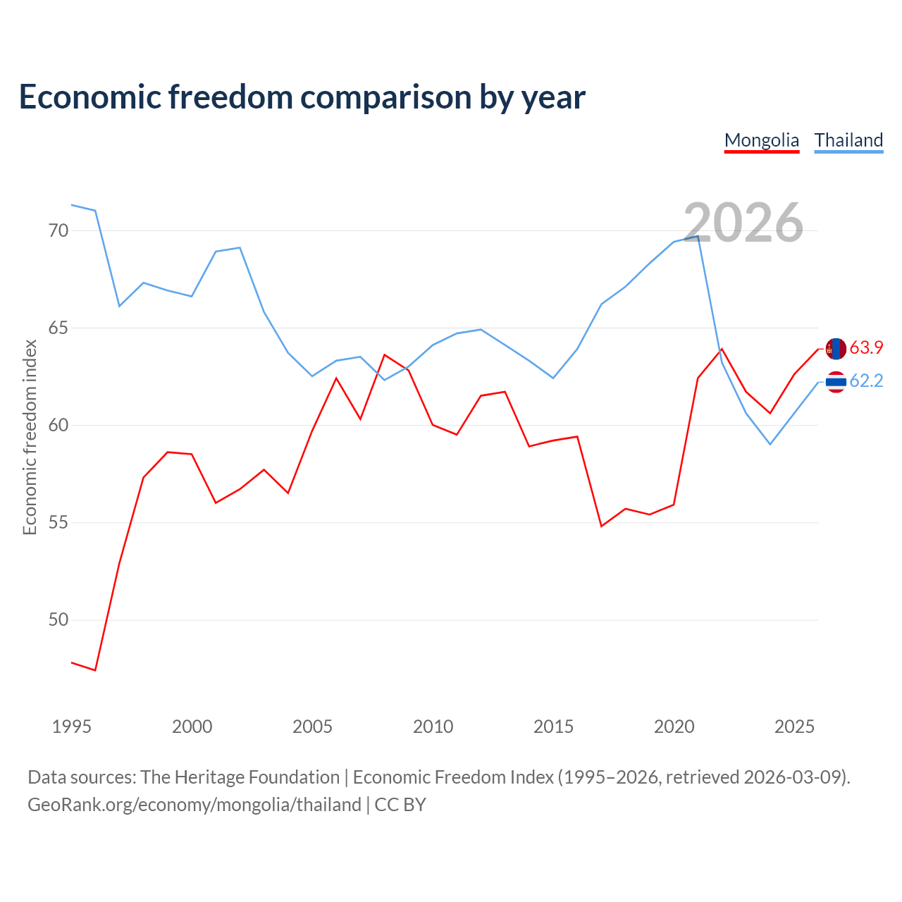 The Economic Freedom Index for Mongolia is 63.9, ranking 76/197, compared to 62.2 for Thailand, ranking 88/197. The chart above displays a comparison of annual changes in economic freedom indexes.