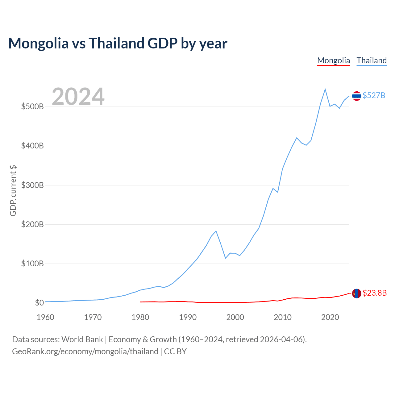 Mongolia has a GDP of $23.8B compared to $527B for Thailand, ranking 121/197 and 31/197 by economy size, respectively.