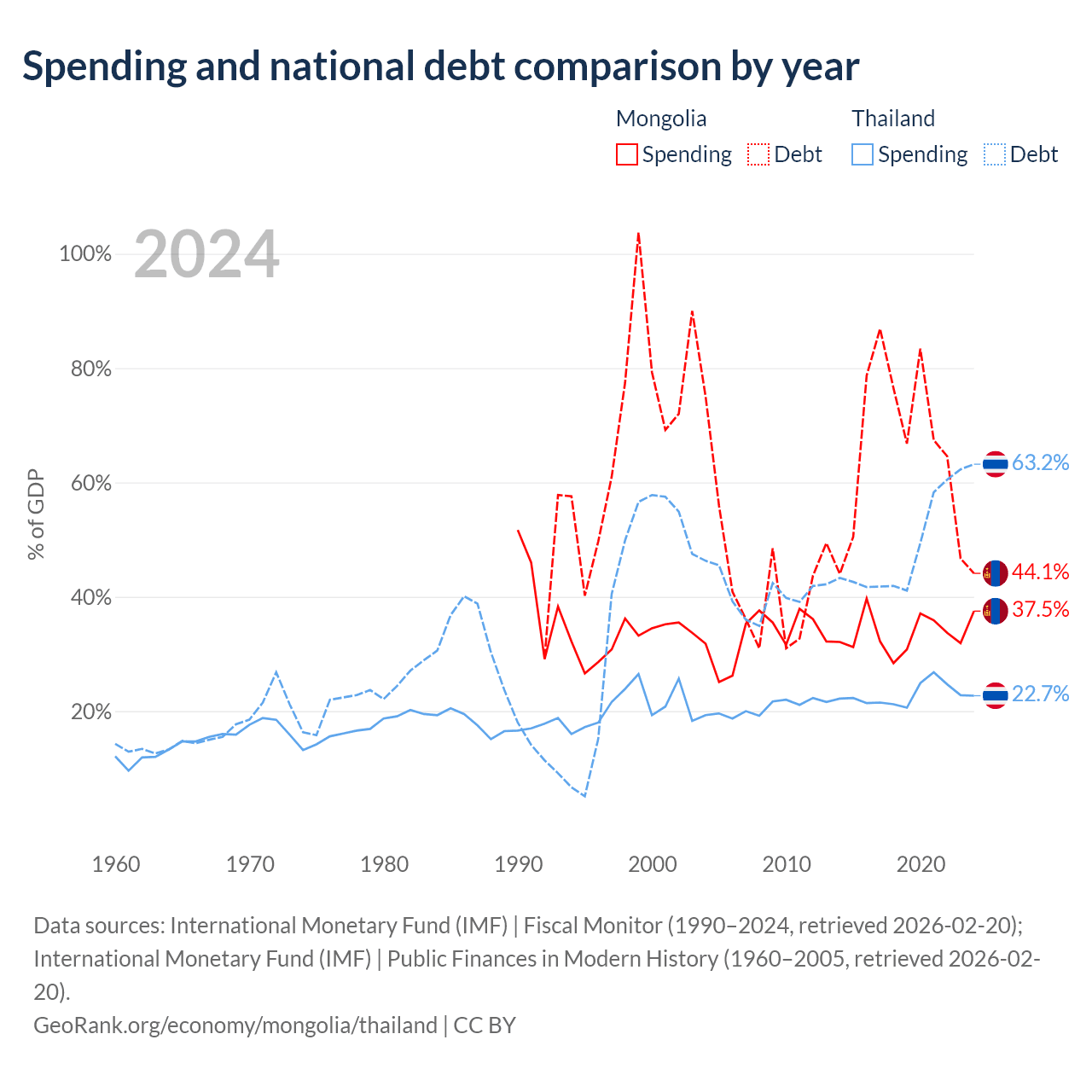 Mongolia has $10.5B in government debt (44.1% of GDP), compared to $333B (63.2% of GDP) in Thailand.