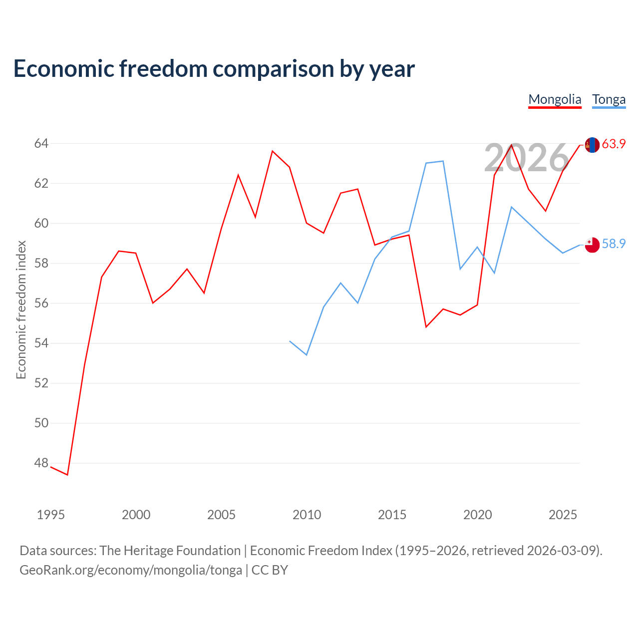 The Economic Freedom Index for Mongolia is 63.9, ranking 76/197, compared to 58.9 for Tonga, ranking 107/197. The chart above displays a comparison of annual changes in economic freedom indexes.