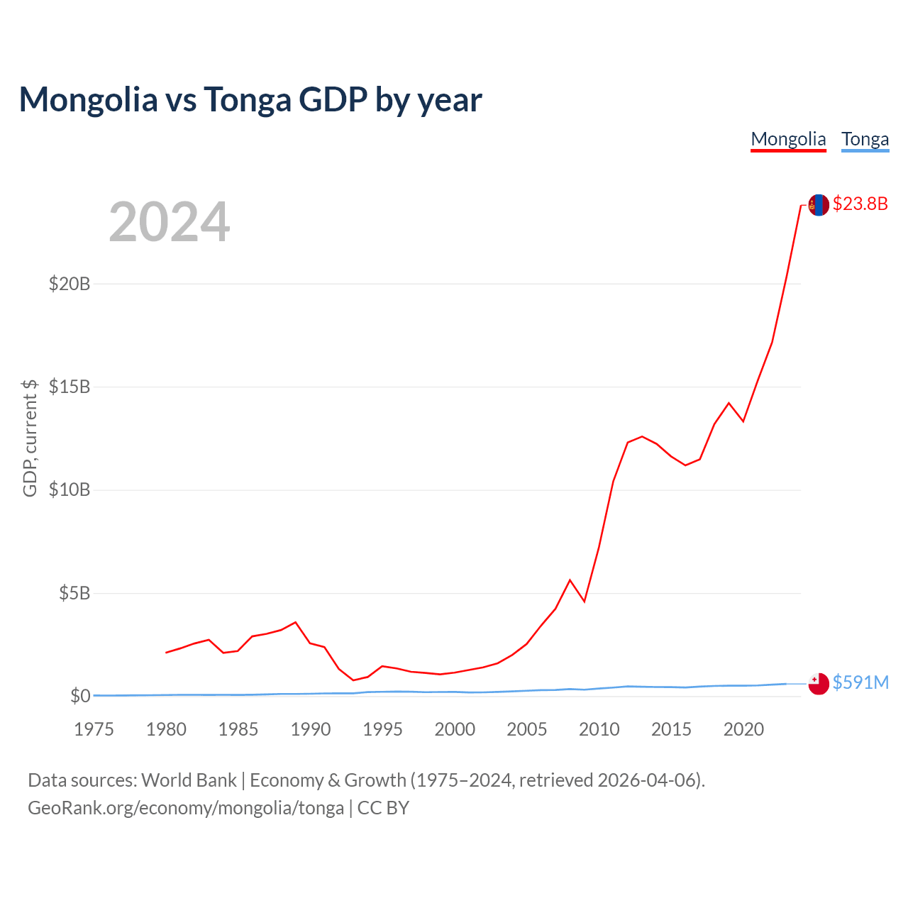Mongolia has a GDP of $23.8B compared to $591M for Tonga, ranking 121/197 and 191/197 by economy size, respectively.