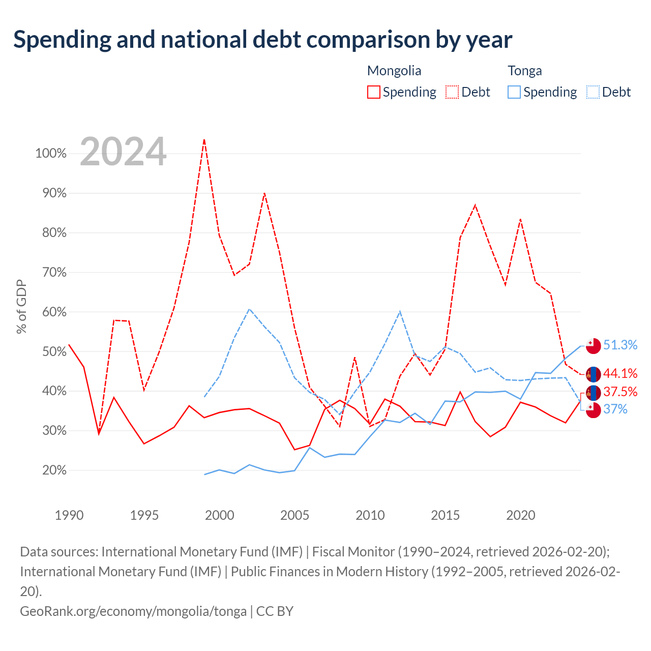 Mongolia has $10.5B in government debt (44.1% of GDP), compared to $256M (37% of GDP) in Tonga.