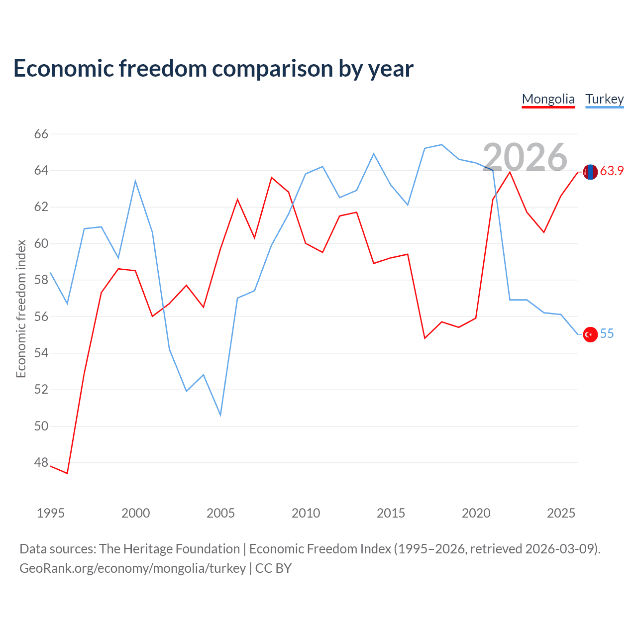 The Economic Freedom Index for Mongolia is 63.9, ranking 76/197, compared to 55 for Turkey, ranking 129/197. The chart above displays a comparison of annual changes in economic freedom indexes.