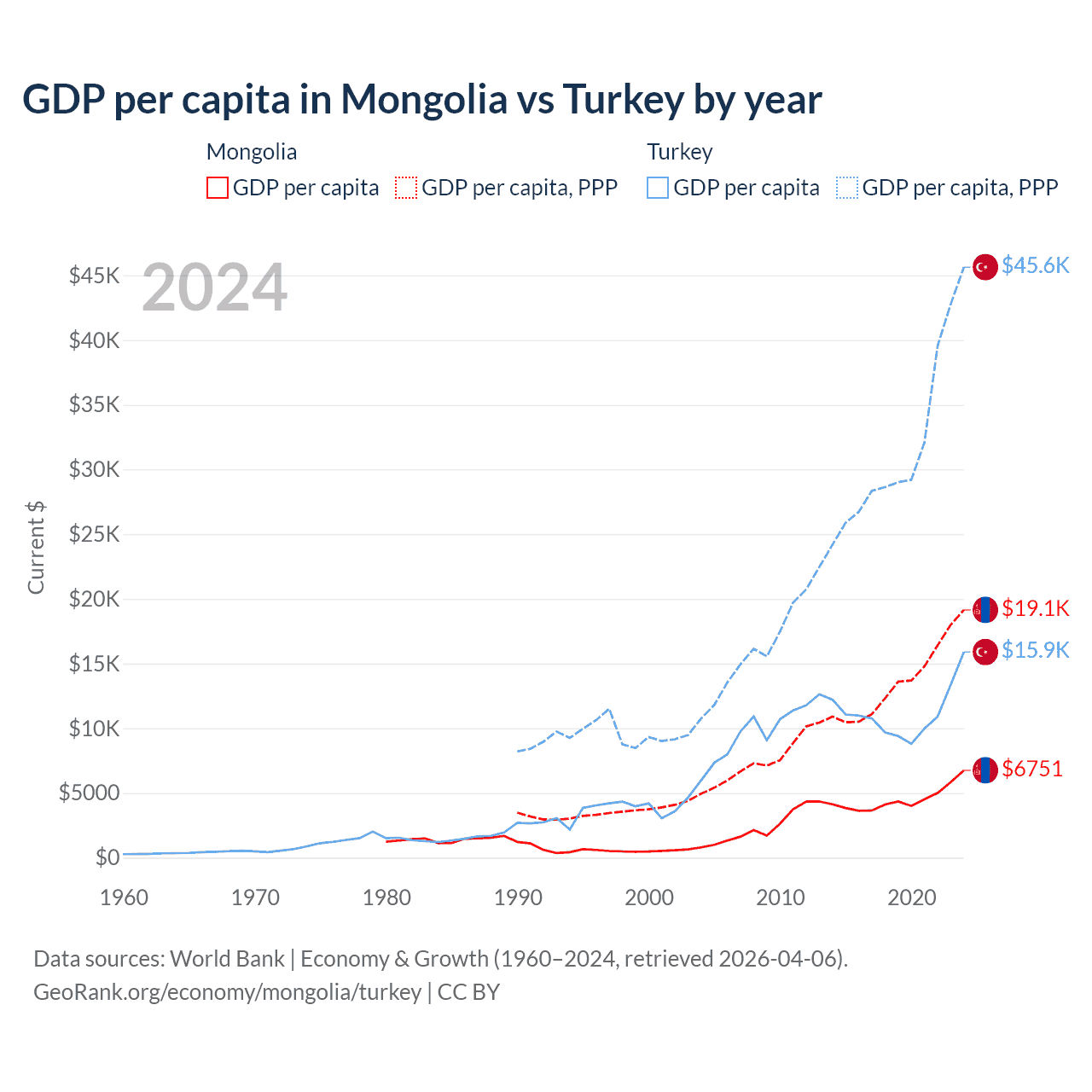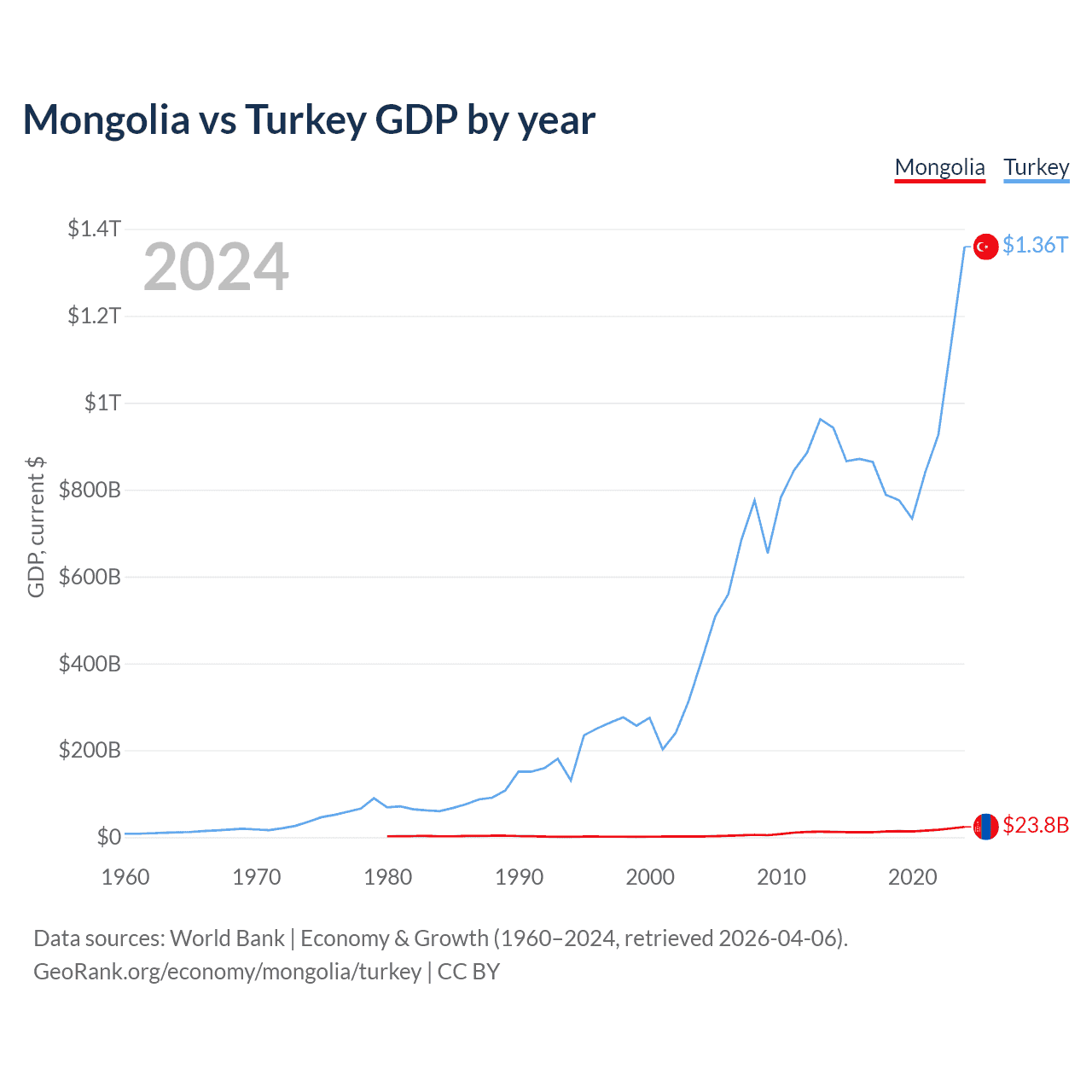 Mongolia has a GDP of $23.8B compared to $1.36T for Turkey, ranking 121/197 and 17/197 by economy size, respectively.