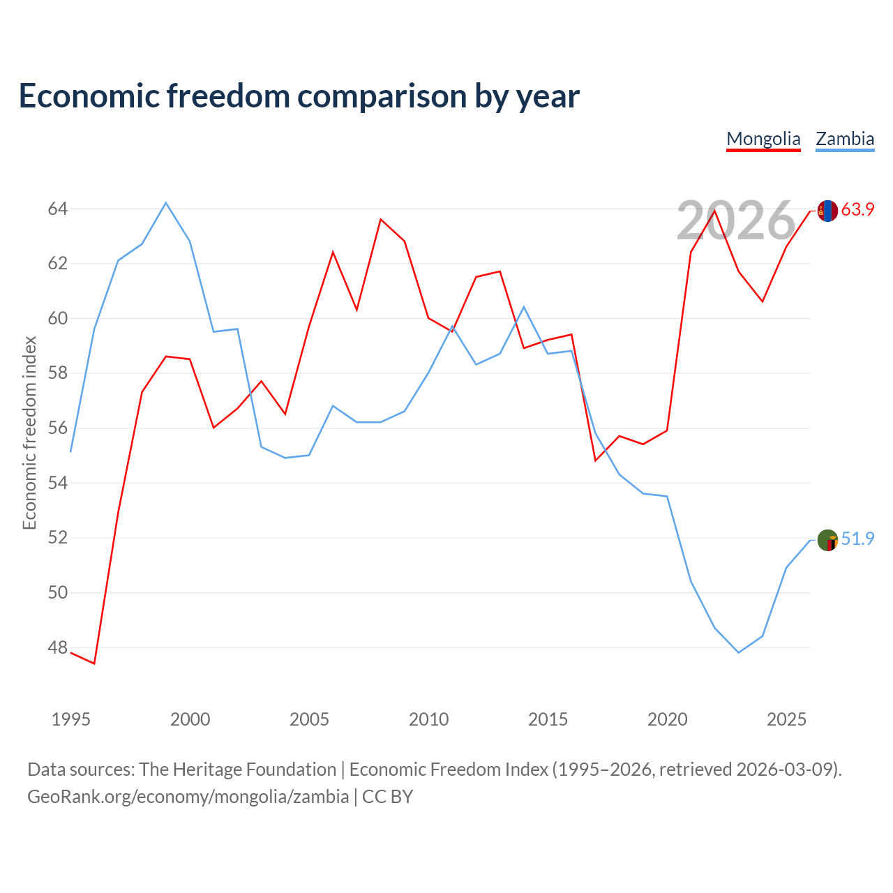 The Economic Freedom Index for Mongolia is 63.9, ranking 76/197, compared to 51.9 for Zambia, ranking 152/197. The chart above displays a comparison of annual changes in economic freedom indexes.
