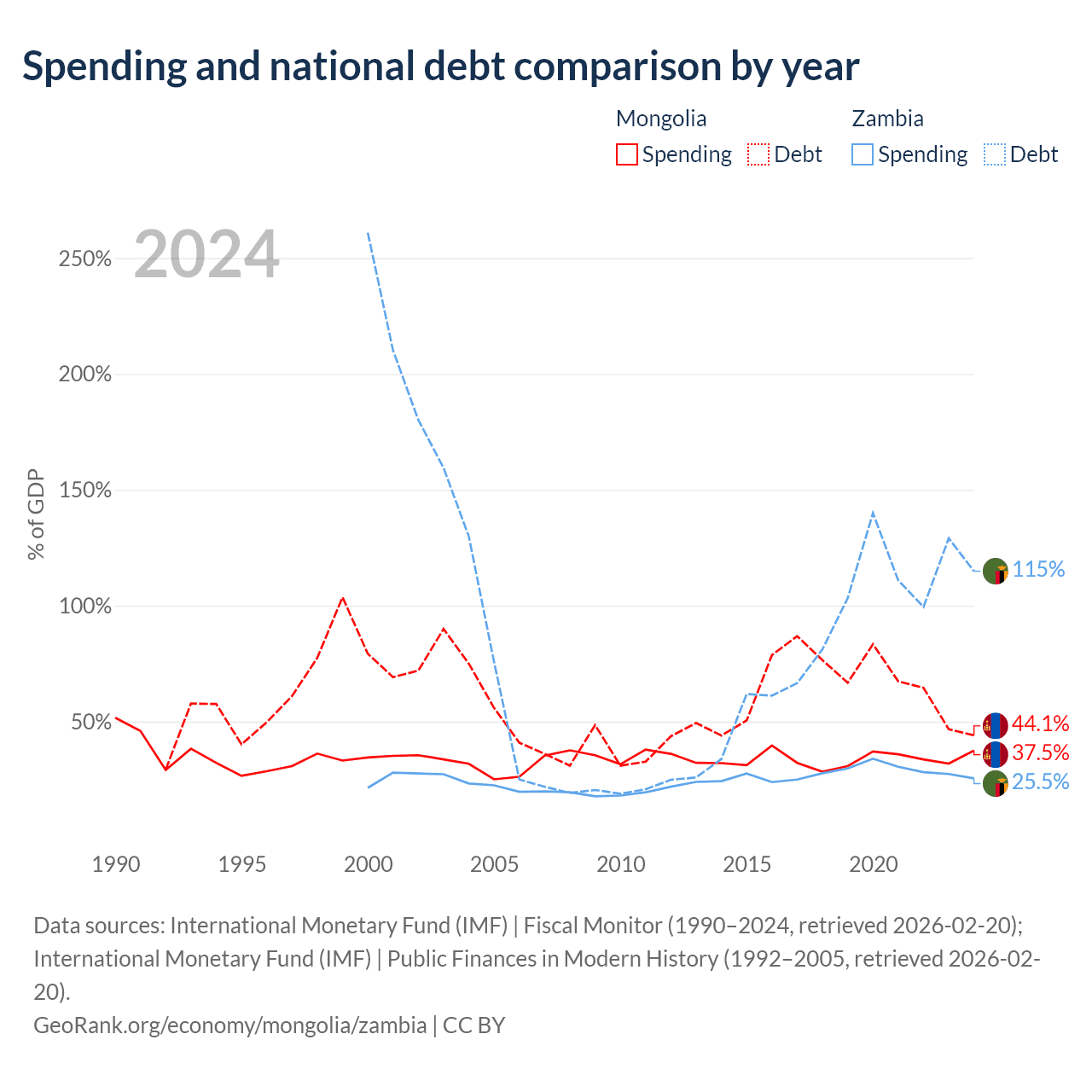 Mongolia has $10.5B in government debt (44.1% of GDP), compared to $29.1B (114.9% of GDP) in Zambia.