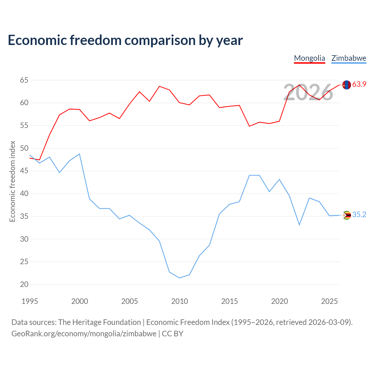The Economic Freedom Index for Mongolia is 63.9, ranking 76/197, compared to 35.2 for Zimbabwe, ranking 190/197. The chart above displays a comparison of annual changes in economic freedom indexes.