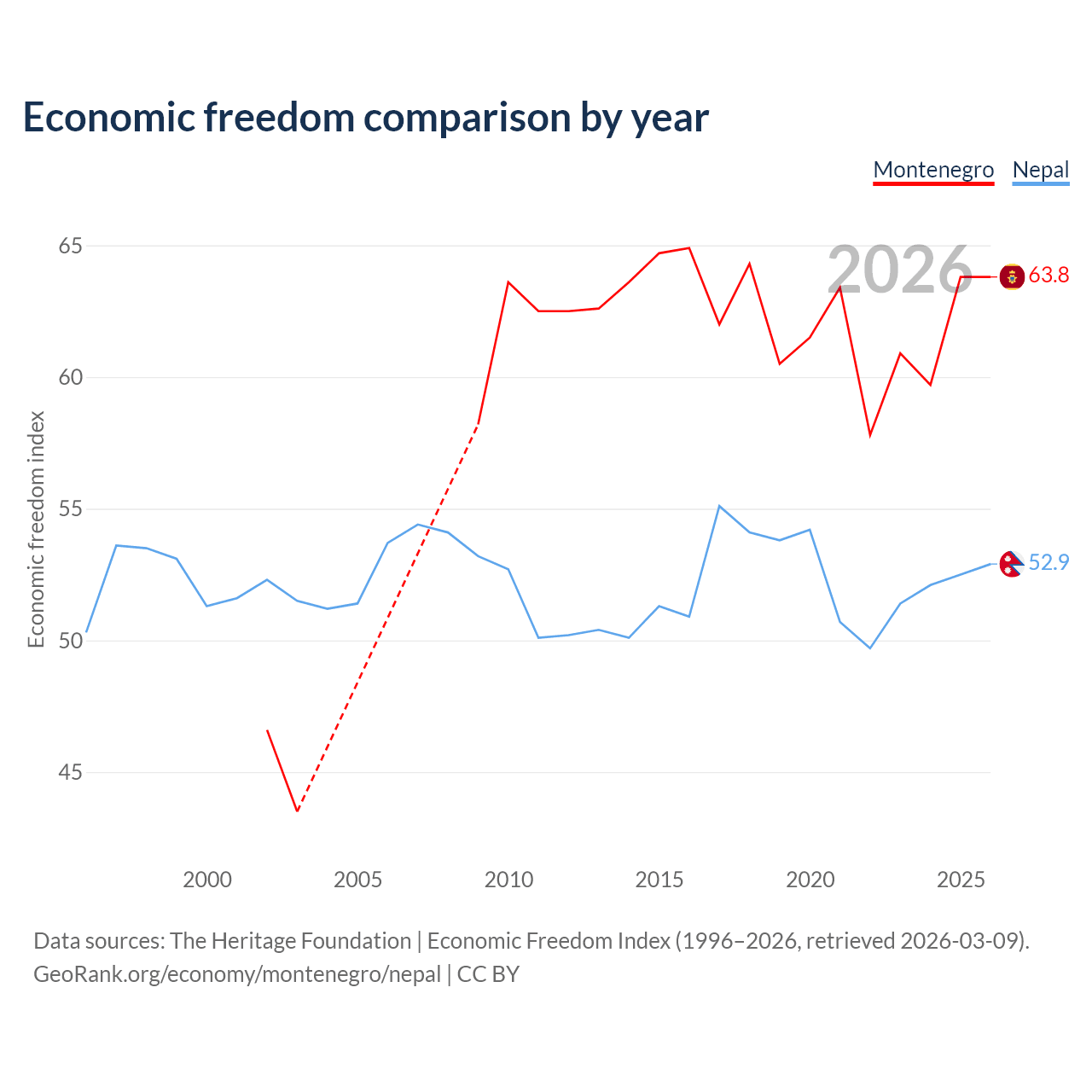 The Economic Freedom Index for Montenegro is 63.8, ranking 78/197, compared to 52.9 for Nepal, ranking 144/197. The chart above displays a comparison of annual changes in economic freedom indexes.