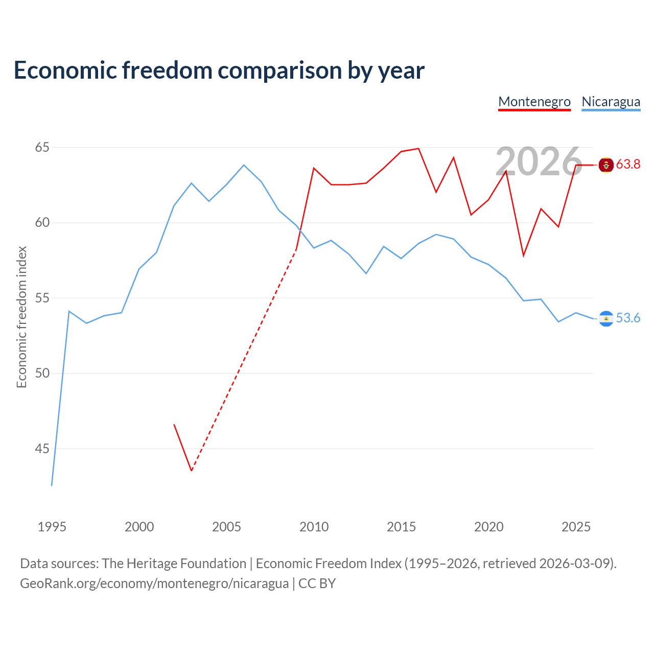 The Economic Freedom Index for Montenegro is 63.8, ranking 78/197, compared to 53.6 for Nicaragua, ranking 139/197. The chart above displays a comparison of annual changes in economic freedom indexes.