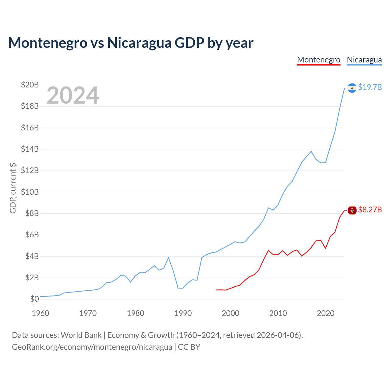 Montenegro has a GDP of $8.27B compared to $19.7B for Nicaragua, ranking 155/197 and 131/197 by economy size, respectively.