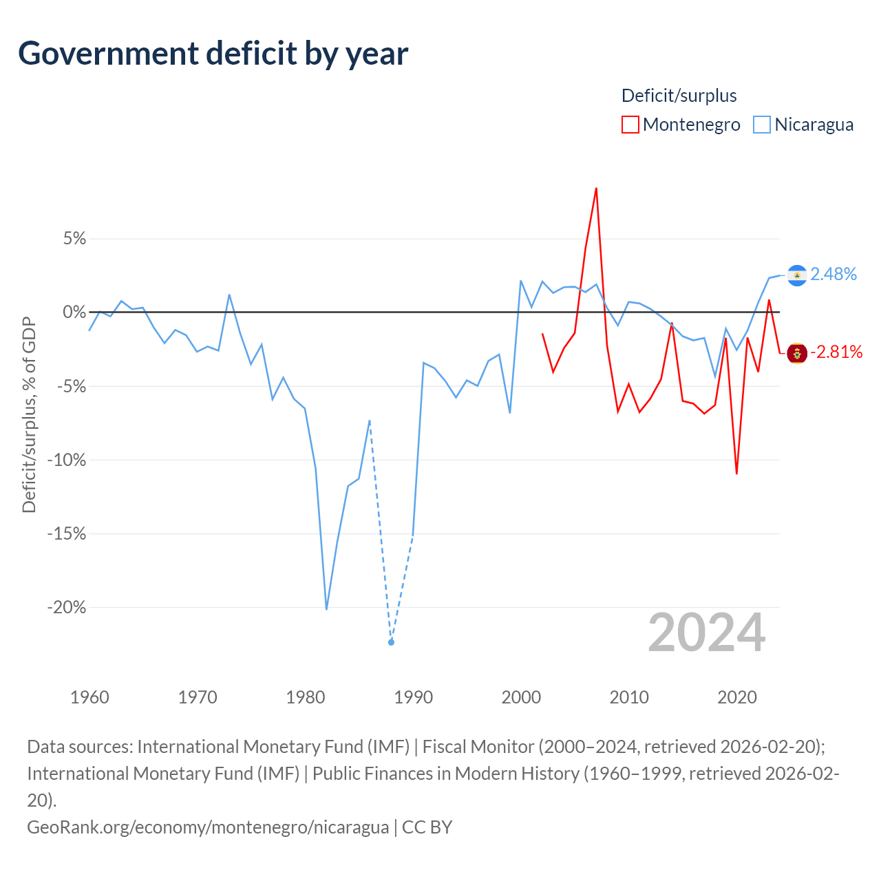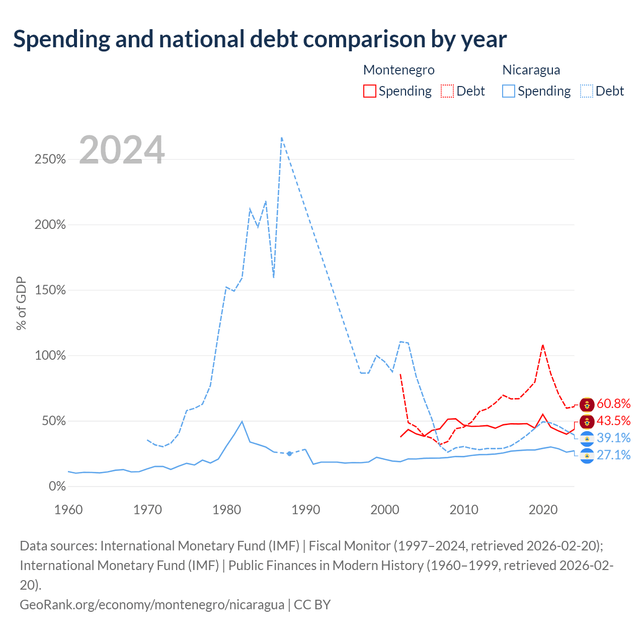 Montenegro has $5.02B in government debt (60.8% of GDP), compared to $7.71B (39.1% of GDP) in Nicaragua.