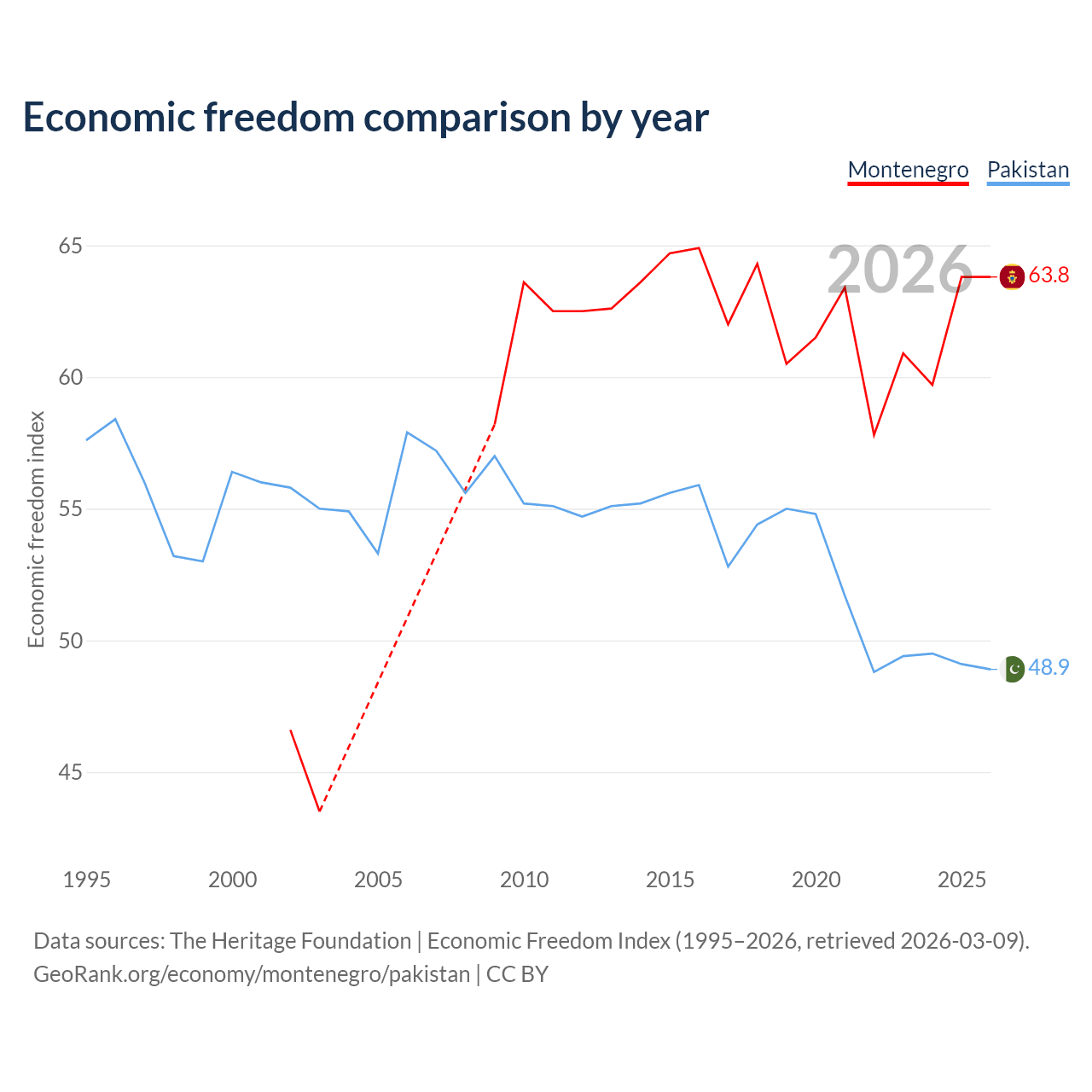 The Economic Freedom Index for Montenegro is 63.8, ranking 78/197, compared to 48.9 for Pakistan, ranking 168/197. The chart above displays a comparison of annual changes in economic freedom indexes.