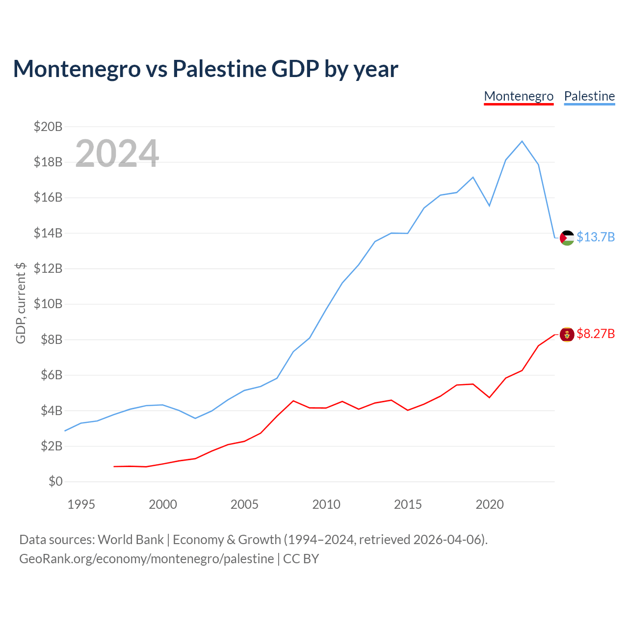 Montenegro vs Palestine GDP by year