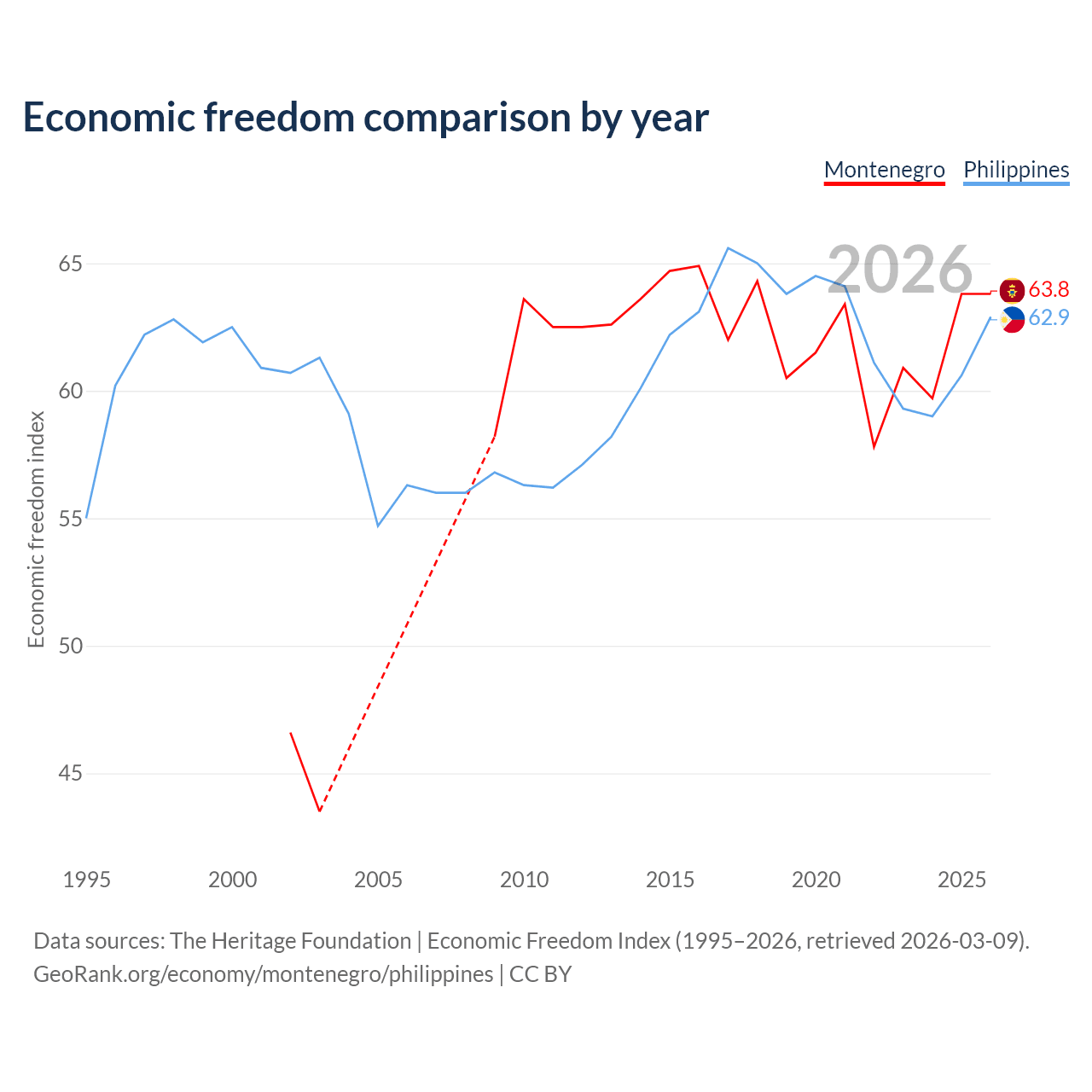 The Economic Freedom Index for Montenegro is 63.8, ranking 78/197, compared to 62.9 for the Philippines, ranking 85/197. The chart above displays a comparison of annual changes in economic freedom indexes.