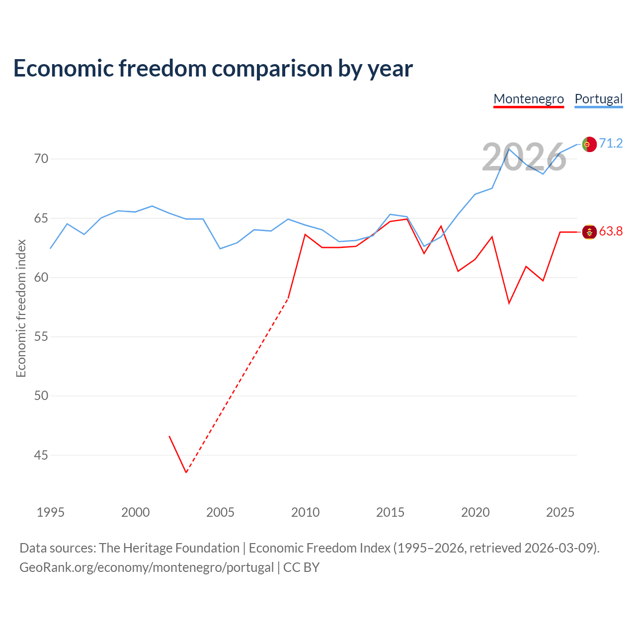 The Economic Freedom Index for Montenegro is 63.8, ranking 78/197, compared to 71.2 for Portugal, ranking 33/197. The chart above displays a comparison of annual changes in economic freedom indexes.