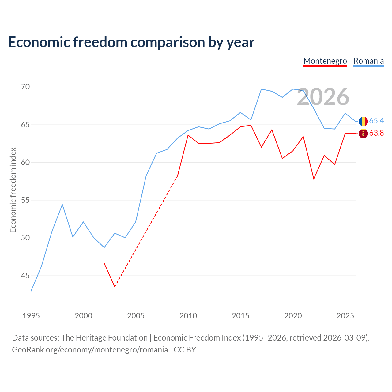 The Economic Freedom Index for Montenegro is 63.8, ranking 78/197, compared to 65.4 for Romania, ranking 64/197. The chart above displays a comparison of annual changes in economic freedom indexes.