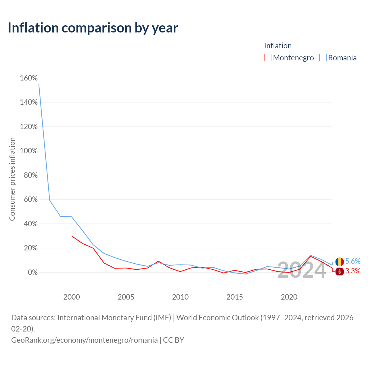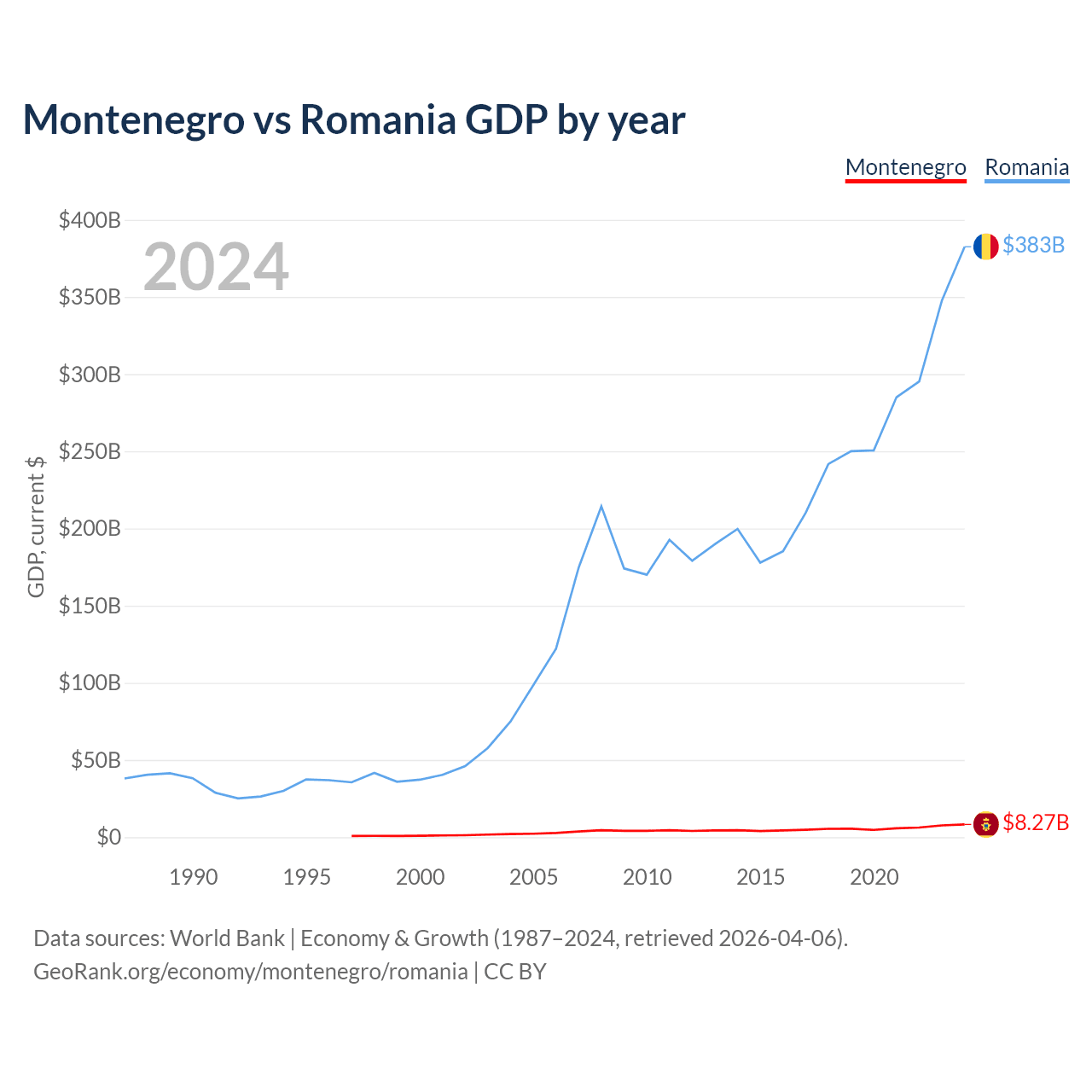 Montenegro has a GDP of $8.27B compared to $383B for Romania, ranking 155/197 and 42/197 by economy size, respectively.