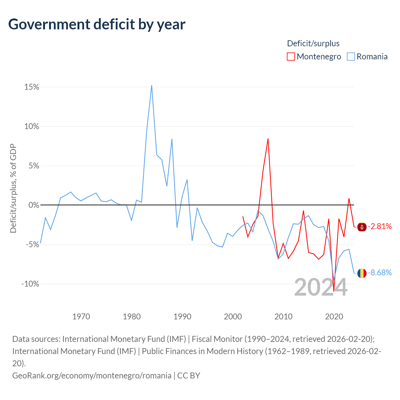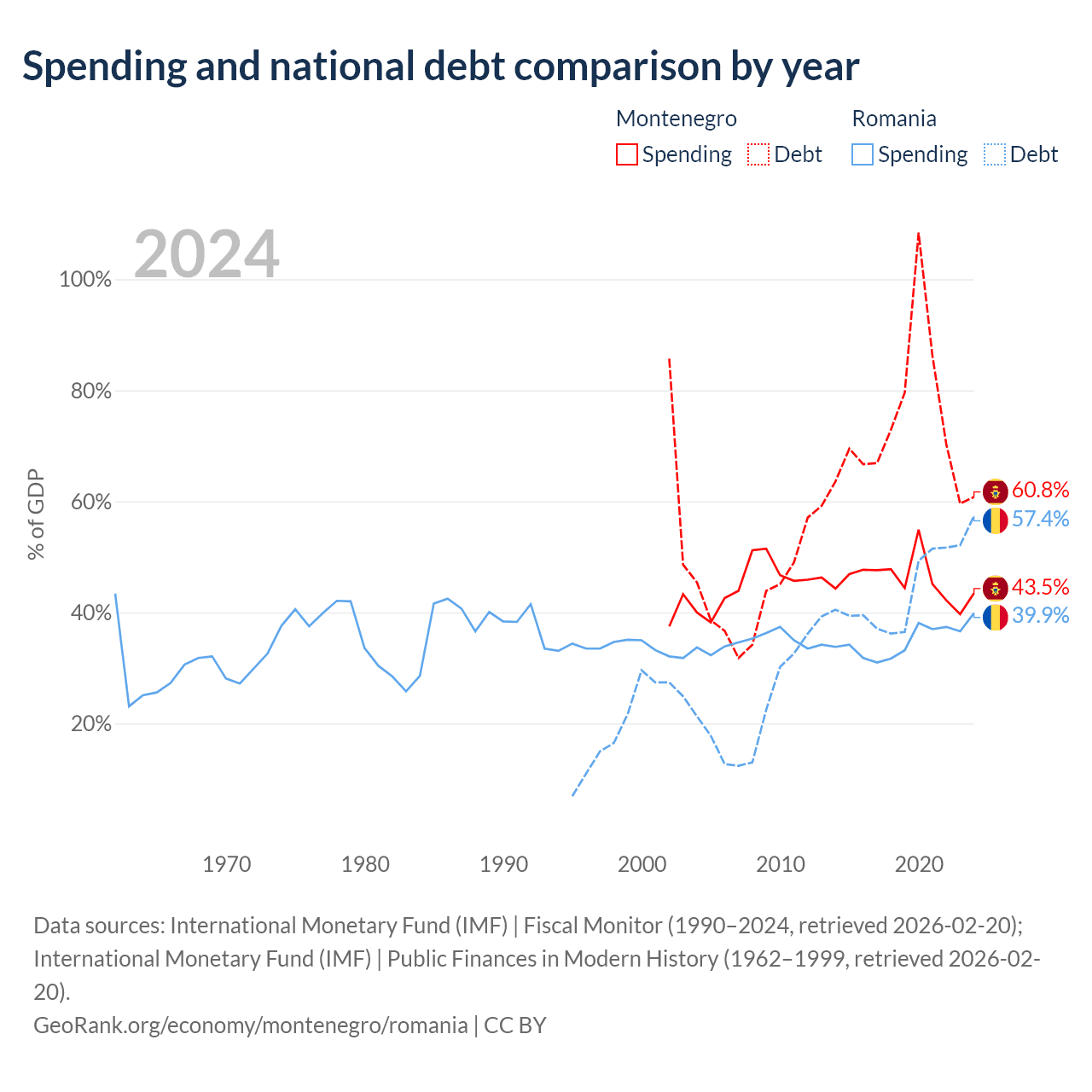 Montenegro has $5.02B in government debt (60.8% of GDP), compared to $220B (57.4% of GDP) in Romania.