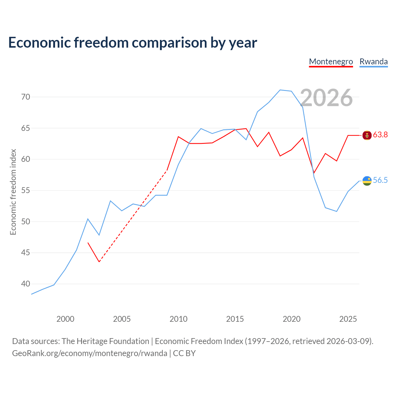 The Economic Freedom Index for Montenegro is 63.8, ranking 78/197, compared to 56.5 for Rwanda, ranking 121/197. The chart above displays a comparison of annual changes in economic freedom indexes.