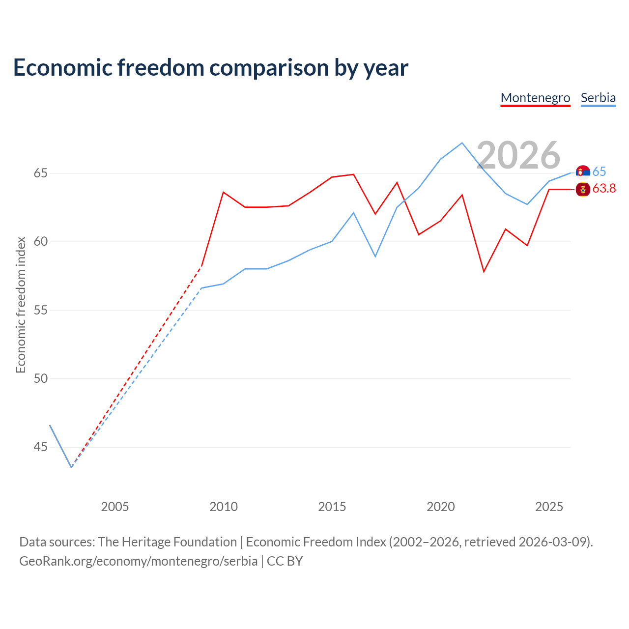 The Economic Freedom Index for Montenegro is 63.8, ranking 78/197, compared to 65 for Serbia, ranking 68/197. The chart above displays a comparison of annual changes in economic freedom indexes.