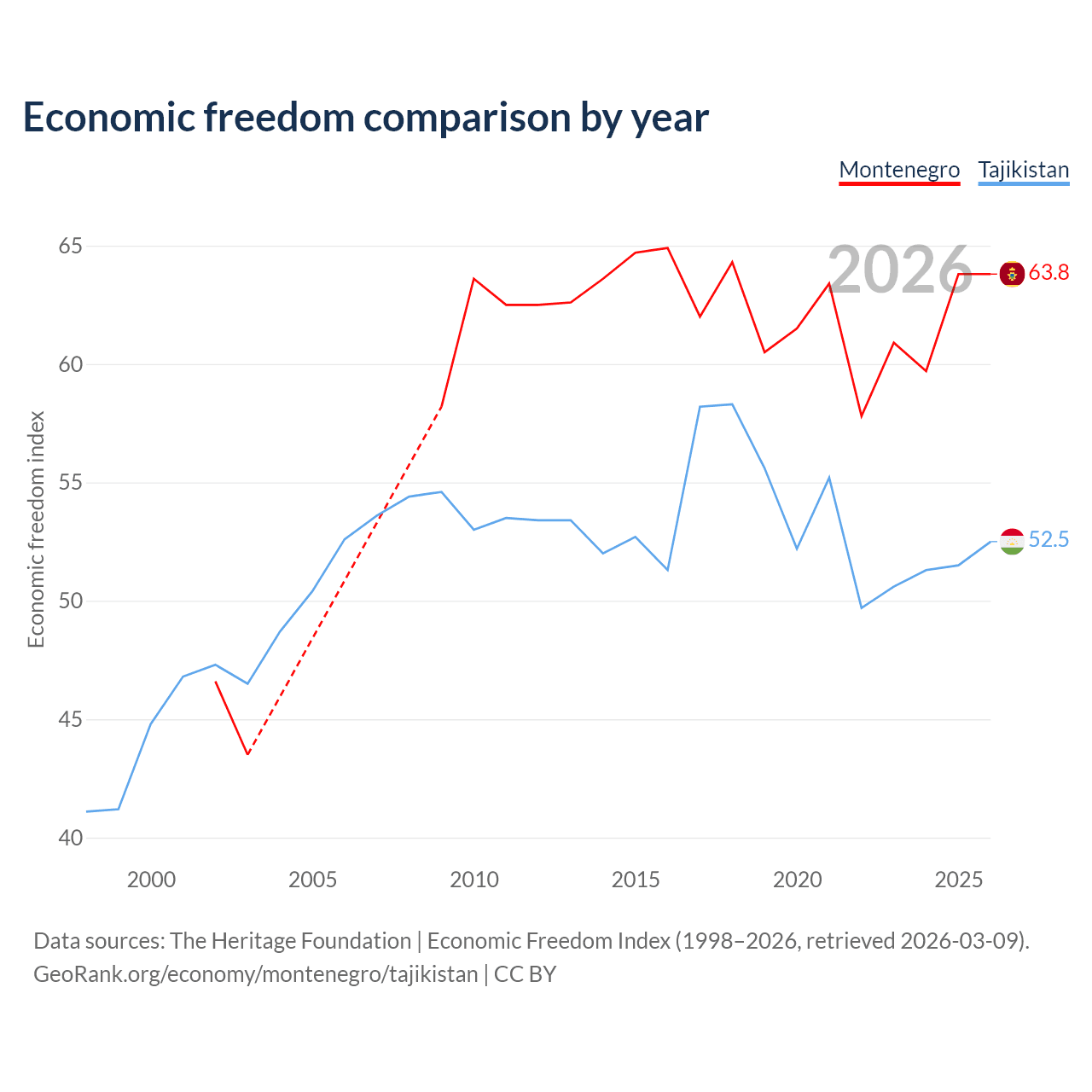 The Economic Freedom Index for Montenegro is 63.8, ranking 78/197, compared to 52.5 for Tajikistan, ranking 147/197. The chart above displays a comparison of annual changes in economic freedom indexes.