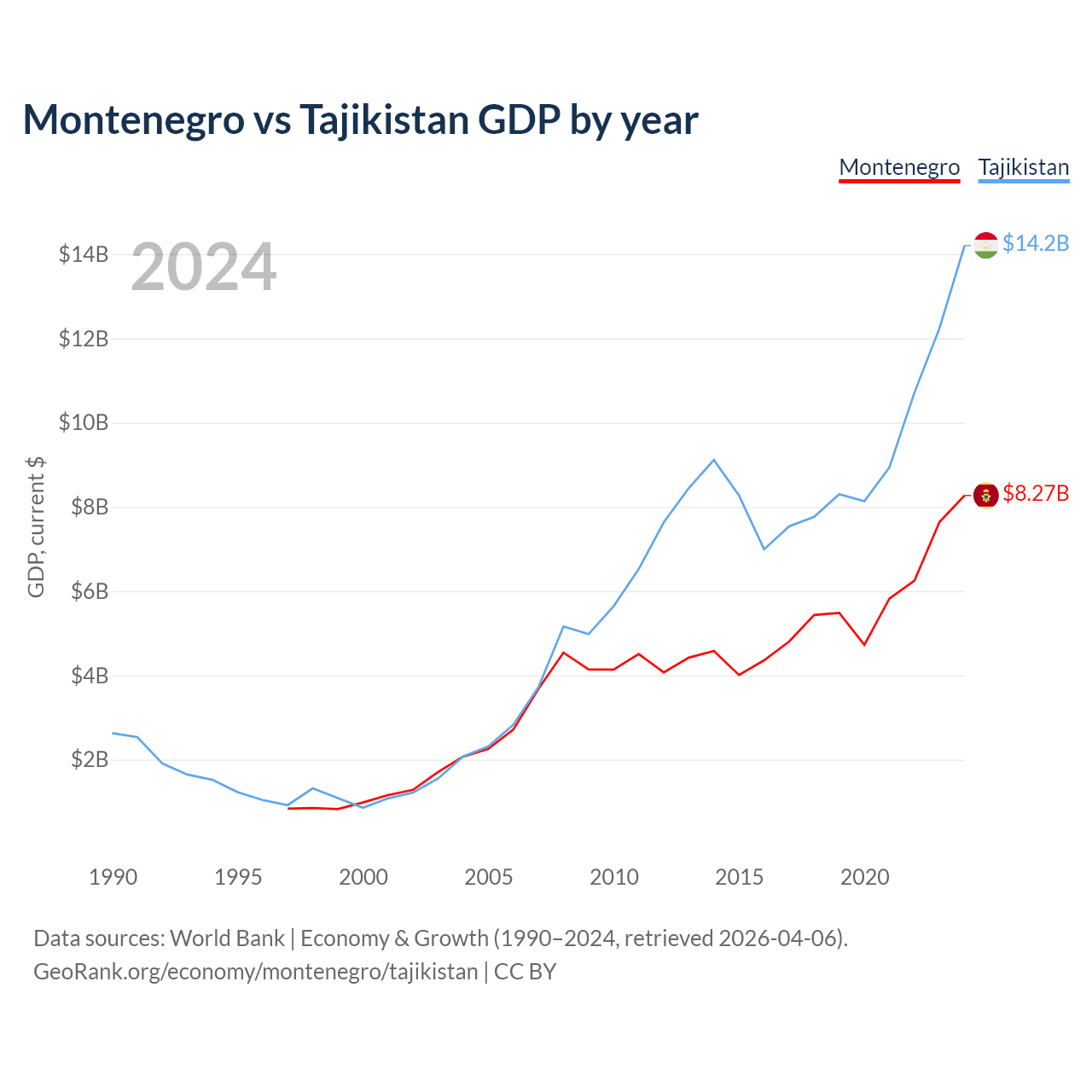 Data sources: World Bank | Economy & Growth (1990–2024, retrieved 2026-04-06).