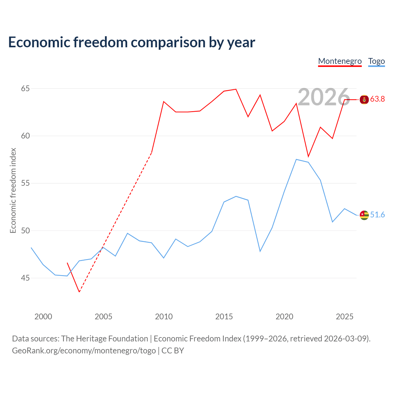 The Economic Freedom Index for Montenegro is 63.8, ranking 78/197, compared to 51.6 for Togo, ranking 153/197. The chart above displays a comparison of annual changes in economic freedom indexes.
