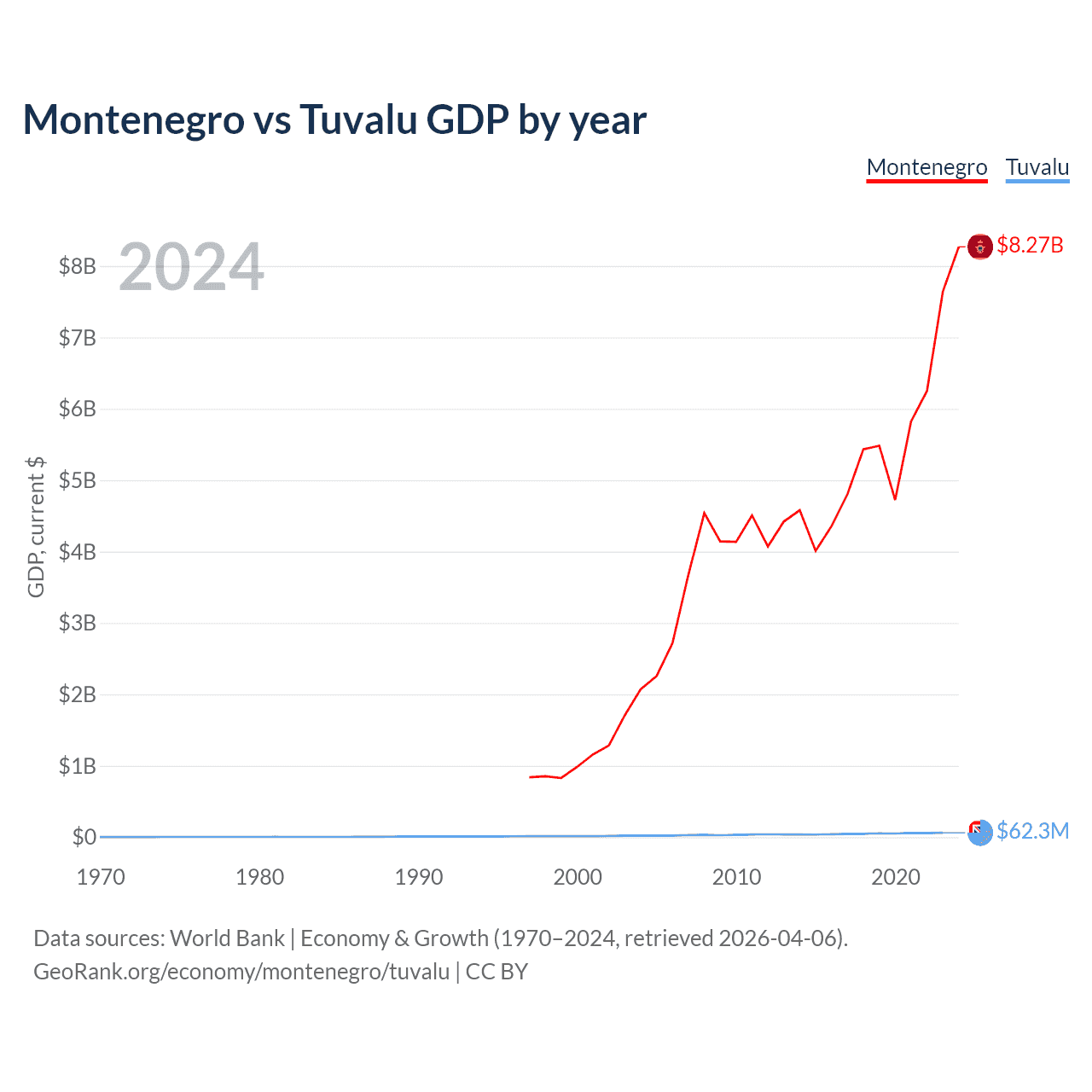 Montenegro has a GDP of $8.27B compared to $62.3M for Tuvalu, ranking 155/197 and 196/197 by economy size, respectively.