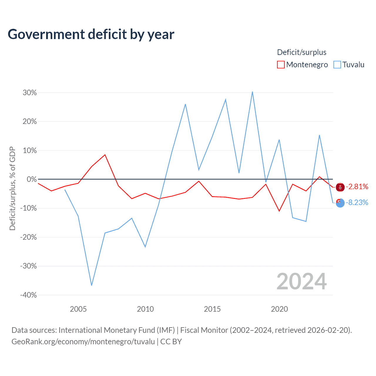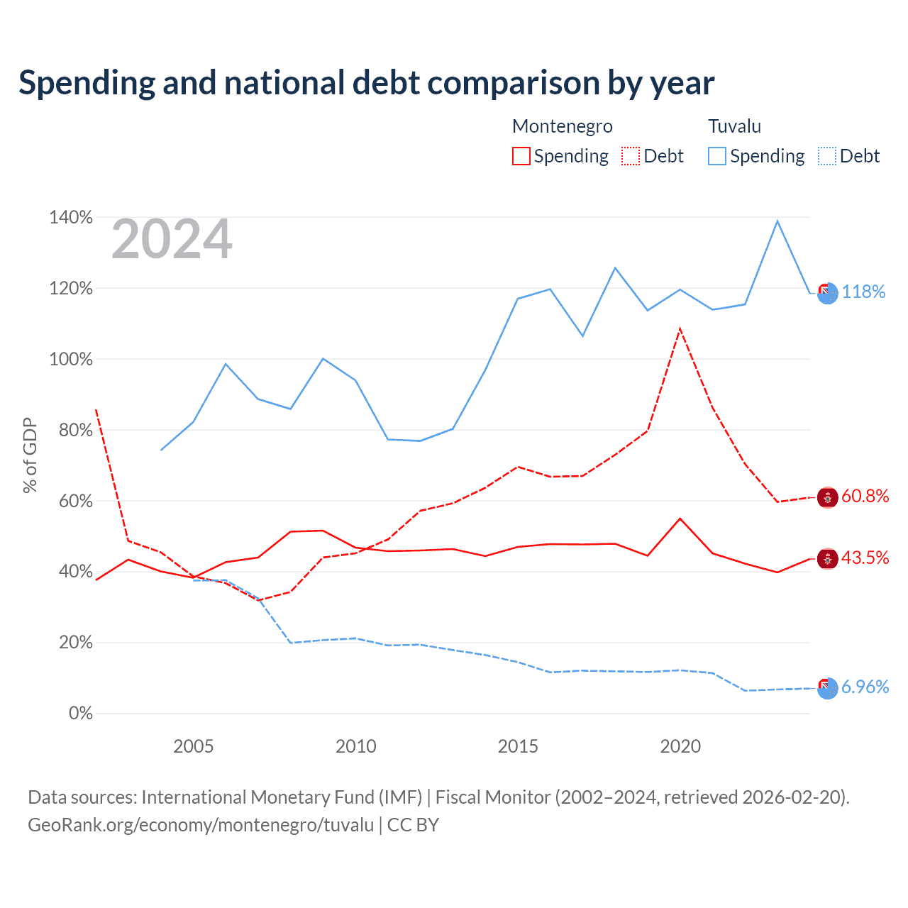 Montenegro has $5.02B in government debt (60.8% of GDP), compared to $4.15M (6.96% of GDP) in Tuvalu.