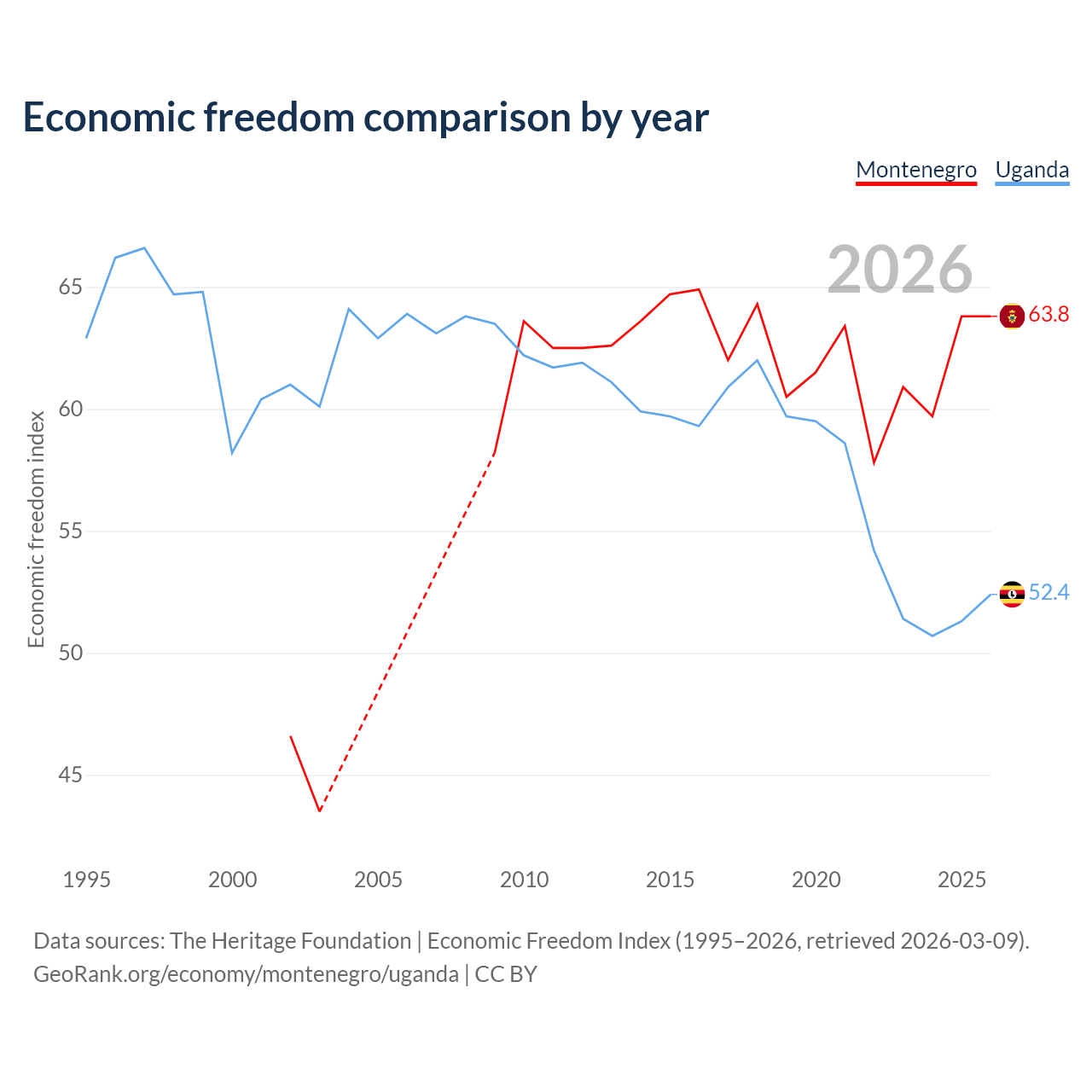 The Economic Freedom Index for Montenegro is 63.8, ranking 78/197, compared to 52.4 for Uganda, ranking 149/197. The chart above displays a comparison of annual changes in economic freedom indexes.