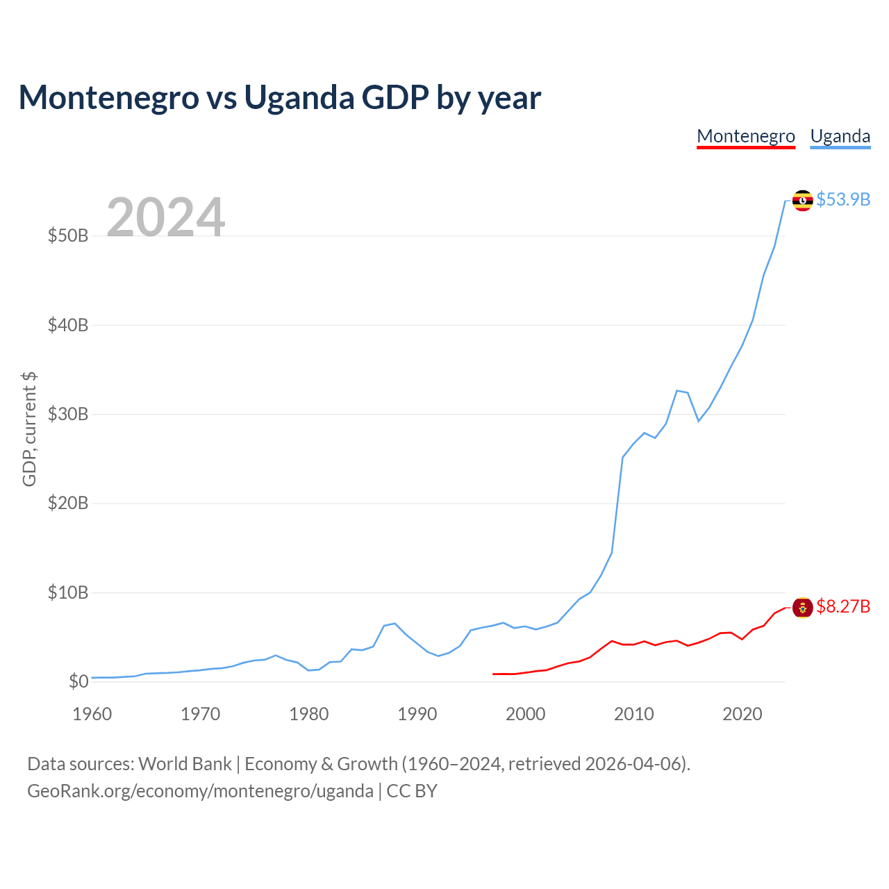 Montenegro vs Uganda GDP by year