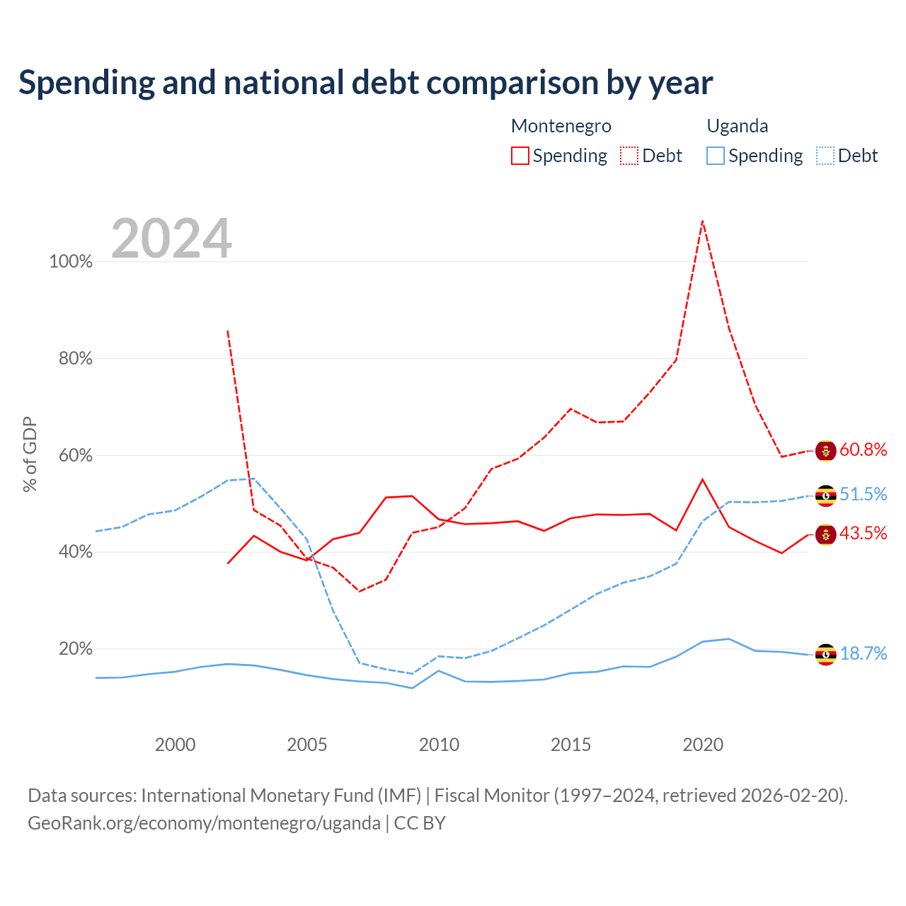 Montenegro has $5.02B in government debt (60.8% of GDP), compared to $27.8B (51.5% of GDP) in Uganda.