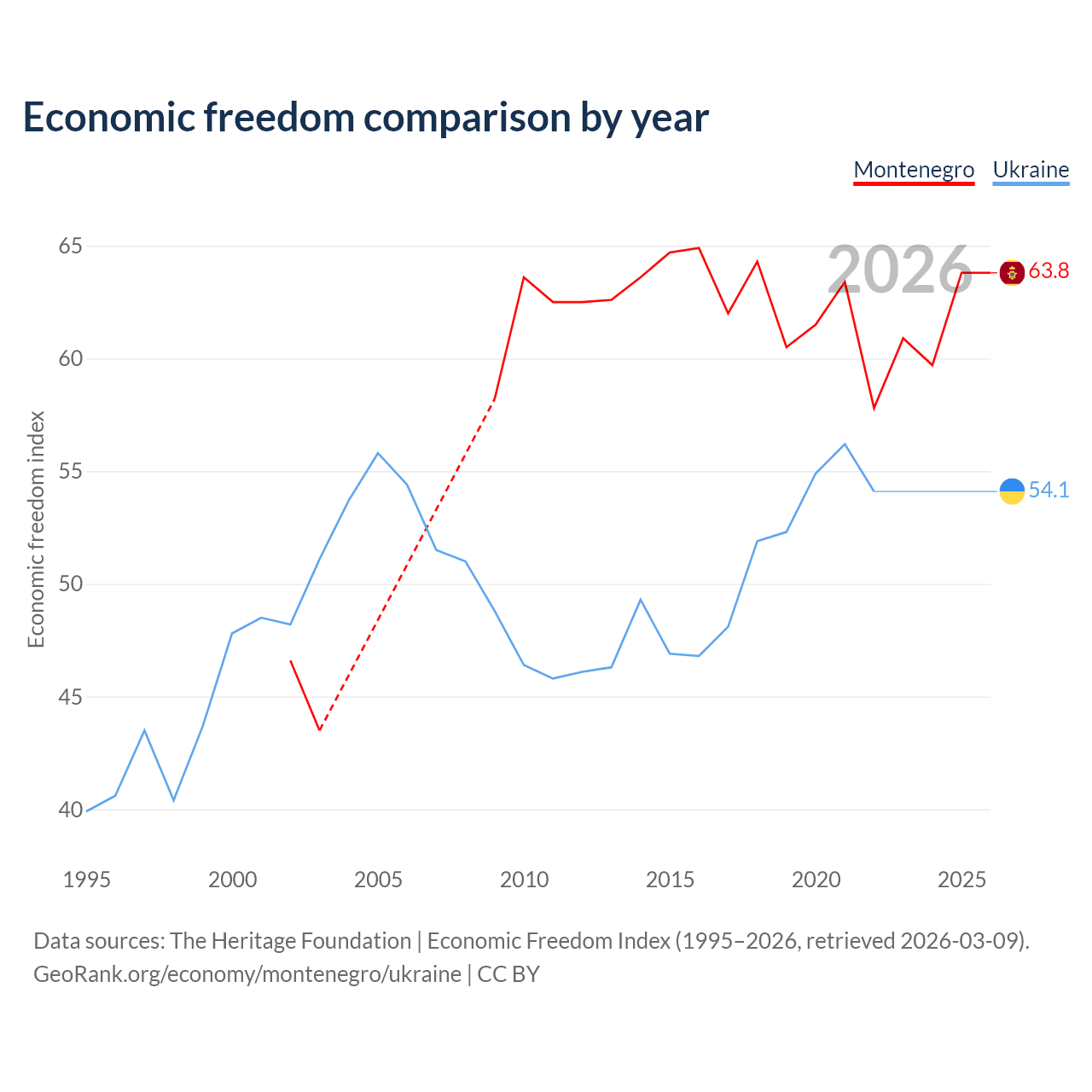 The Economic Freedom Index for Montenegro is 63.8, ranking 78/197, compared to 54.1 for Ukraine, ranking 135/197. The chart above displays a comparison of annual changes in economic freedom indexes.