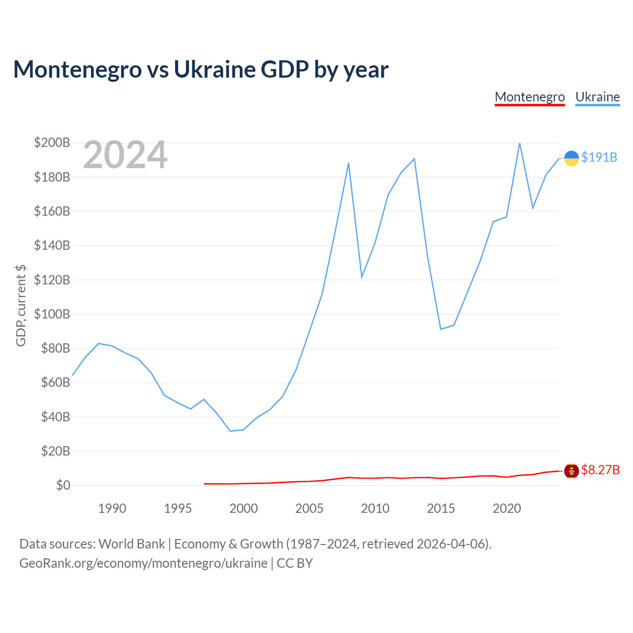 Montenegro has a GDP of $8.27B compared to $191B for Ukraine, ranking 155/197 and 57/197 by economy size, respectively.
