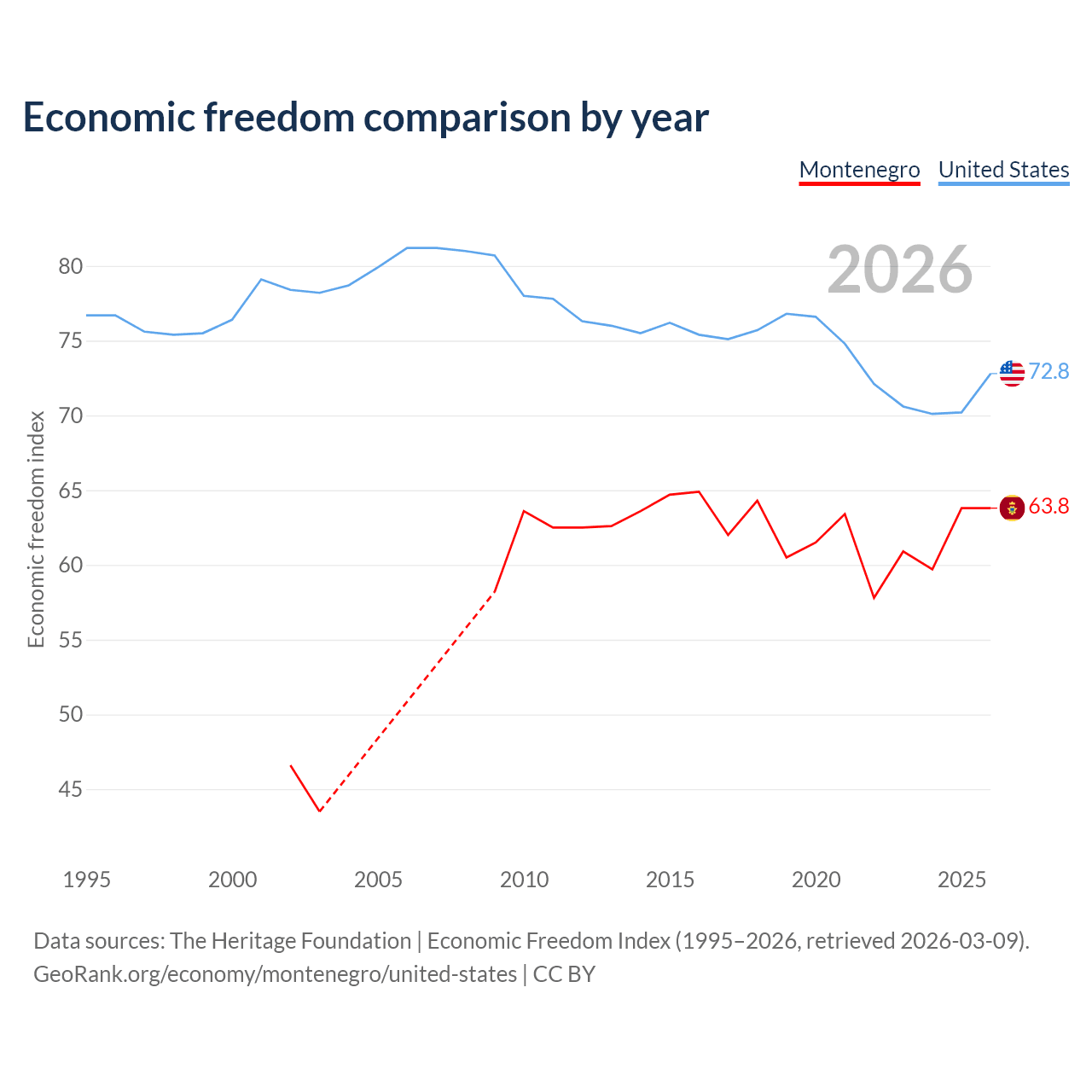 The Economic Freedom Index for Montenegro is 63.8, ranking 78/197, compared to 72.8 for the United States, ranking 27/197. The chart above displays a comparison of annual changes in economic freedom indexes.