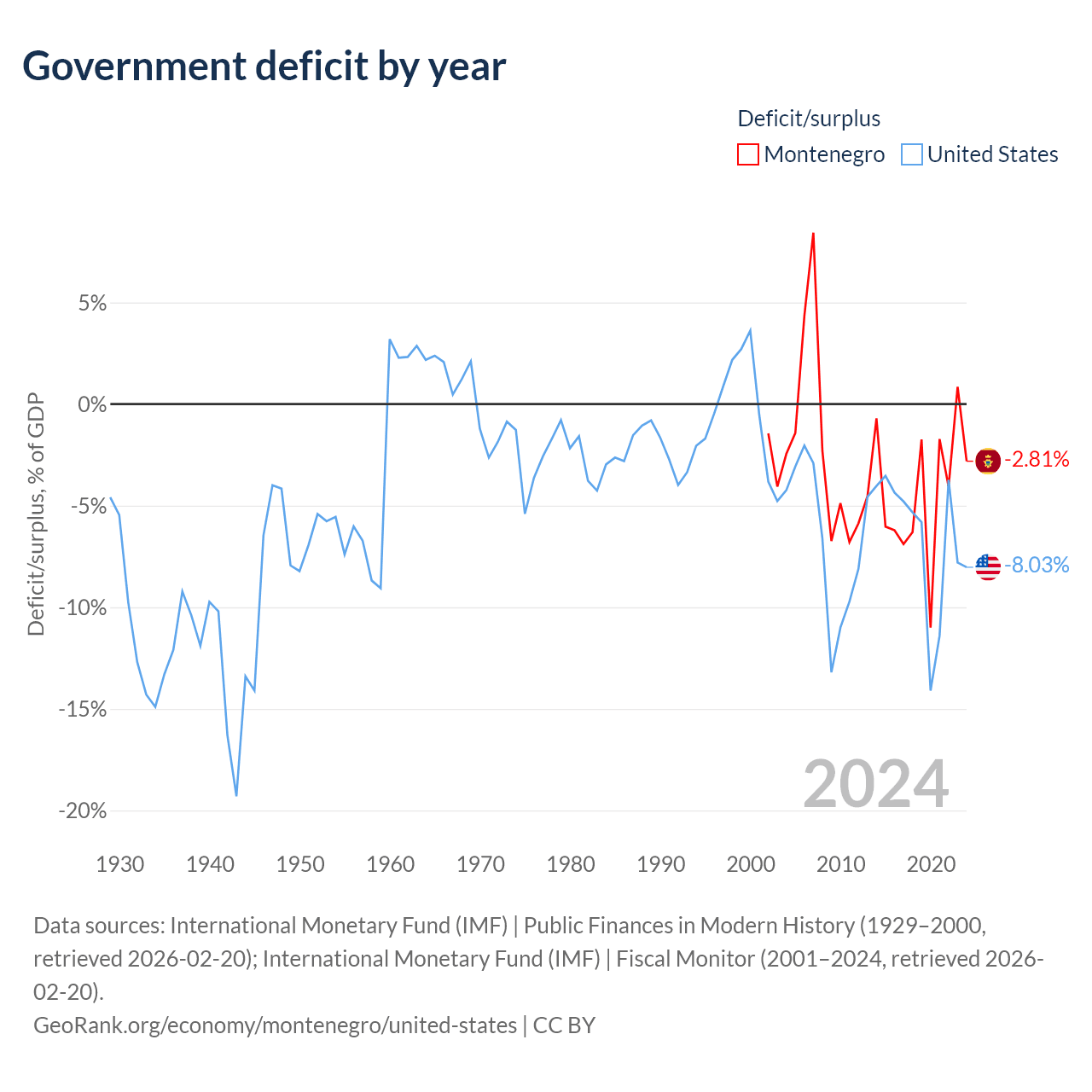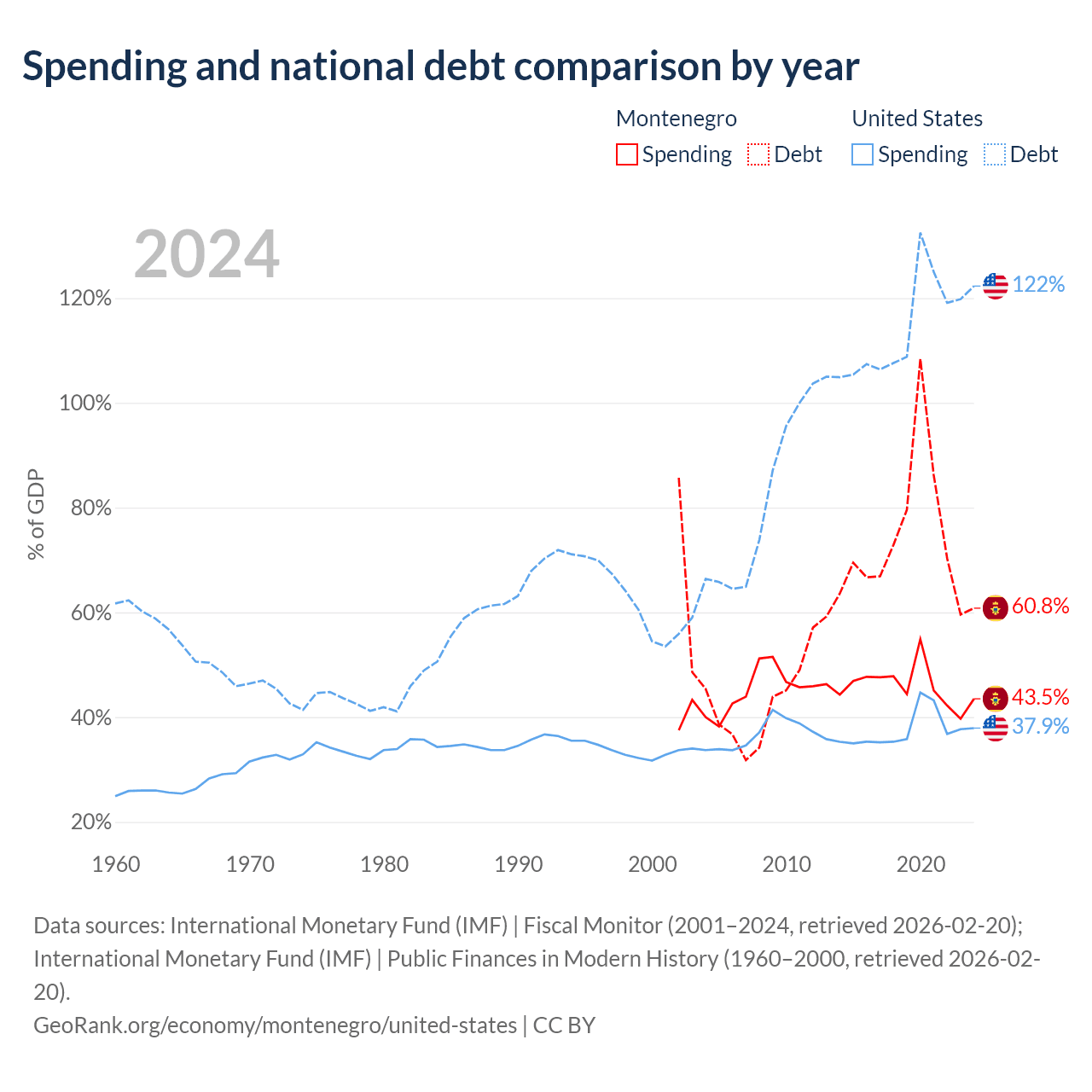 Montenegro has $5.02B in government debt (60.8% of GDP), compared to $35.2T (122.3% of GDP) in the United States.