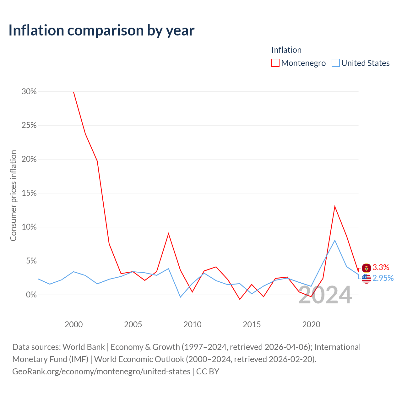 Montenegro has a GDP of $8.27B compared to $28.8T for the United States, ranking 155/197 and 1/197 by economy size, respectively.