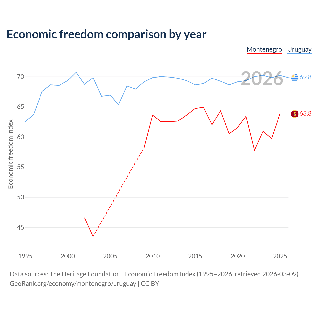 The Economic Freedom Index for Montenegro is 63.8, ranking 78/197, compared to 69.8 for Uruguay, ranking 39/197. The chart above displays a comparison of annual changes in economic freedom indexes.