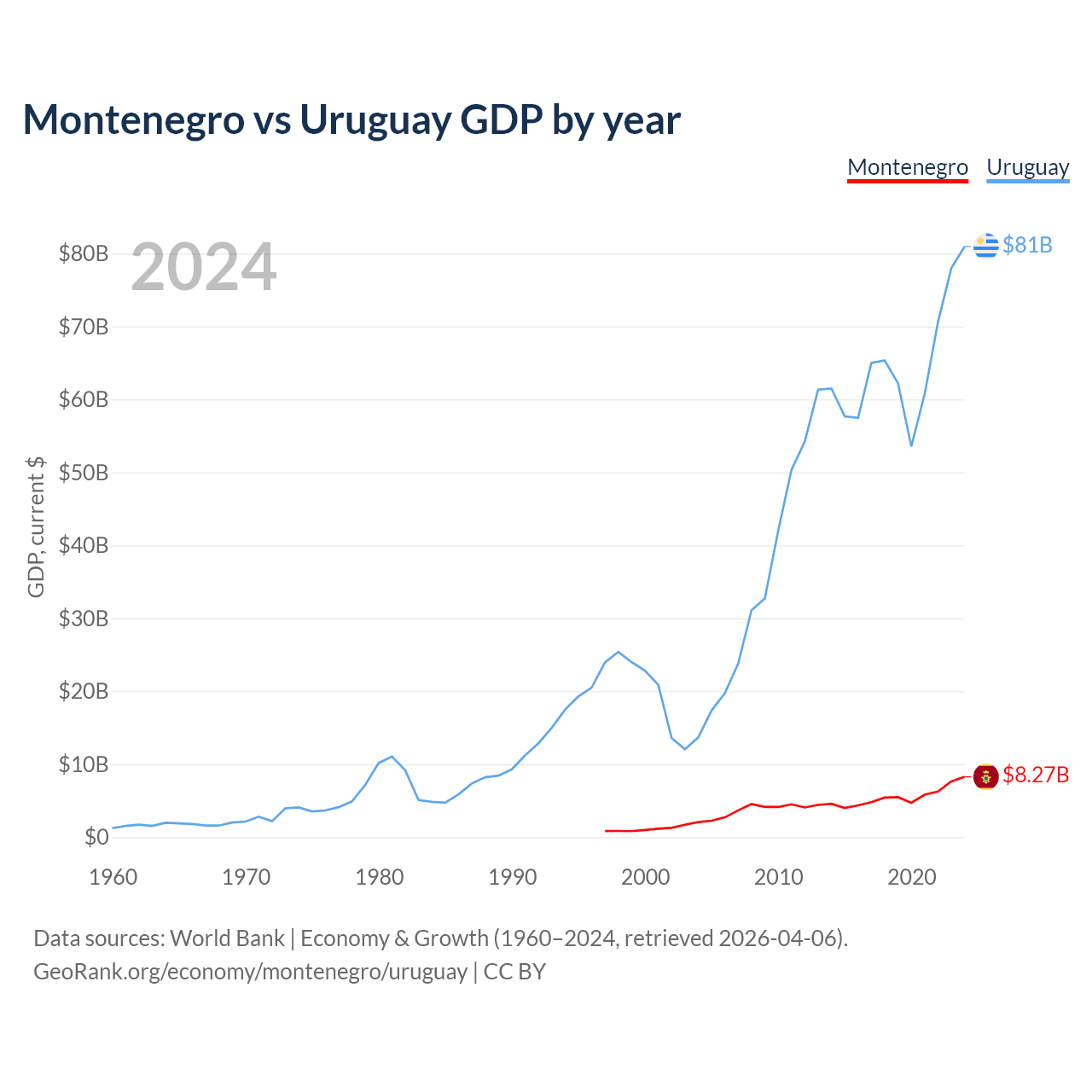 Montenegro has a GDP of $8.27B compared to $81B for Uruguay, ranking 155/197 and 81/197 by economy size, respectively.