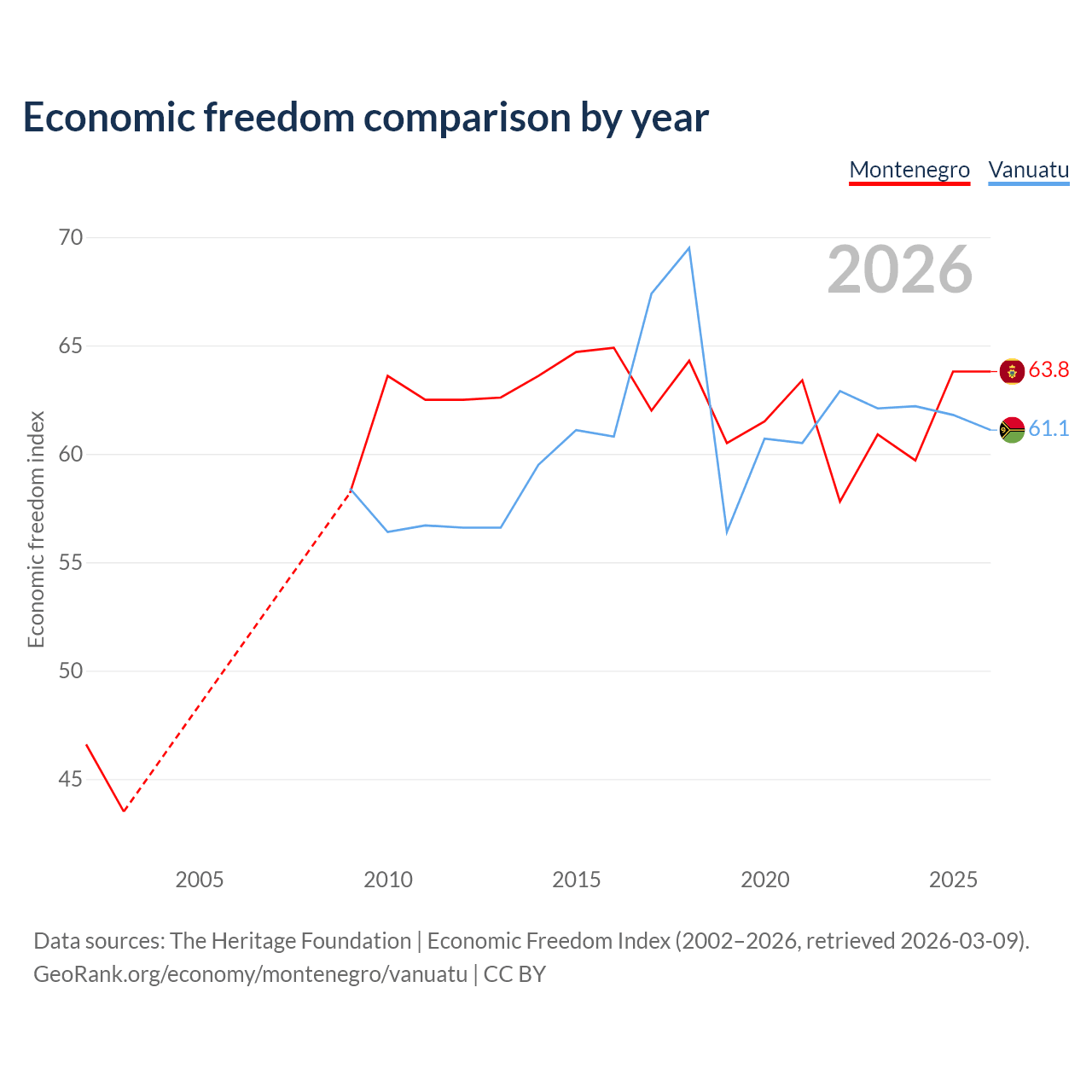 The Economic Freedom Index for Montenegro is 63.8, ranking 78/197, compared to 61.1 for Vanuatu, ranking 92/197. The chart above displays a comparison of annual changes in economic freedom indexes.