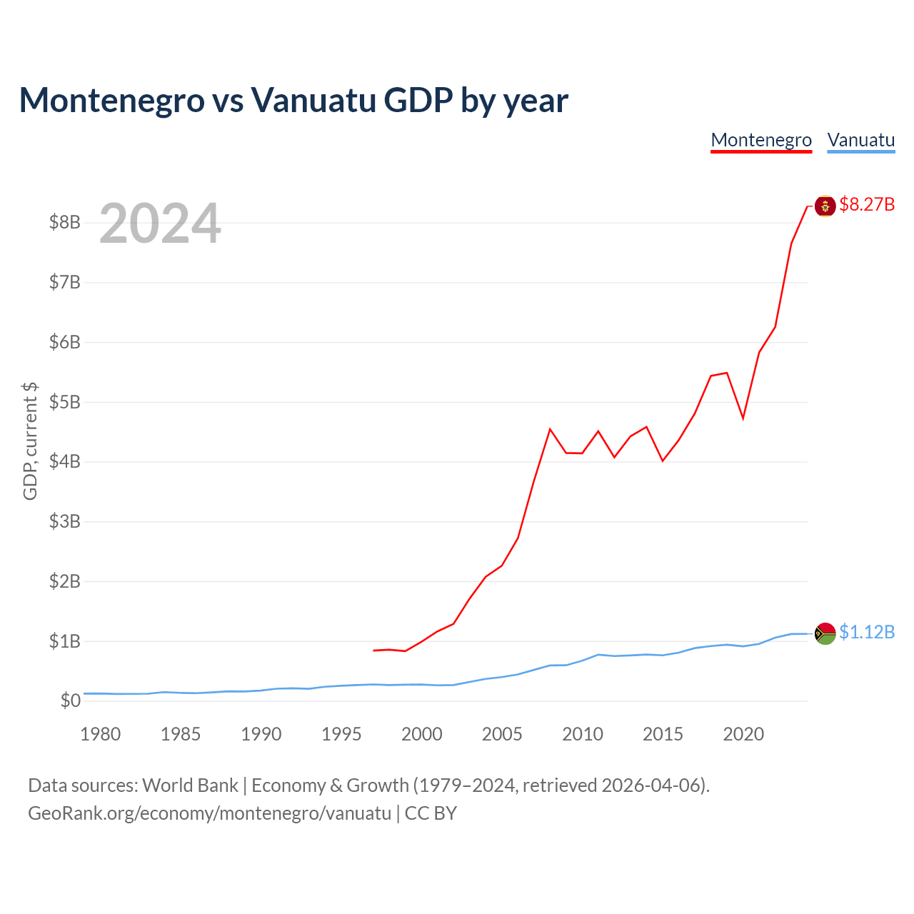 Montenegro has a GDP of $8.27B compared to $1.12B for Vanuatu, ranking 155/197 and 188/197 by economy size, respectively.